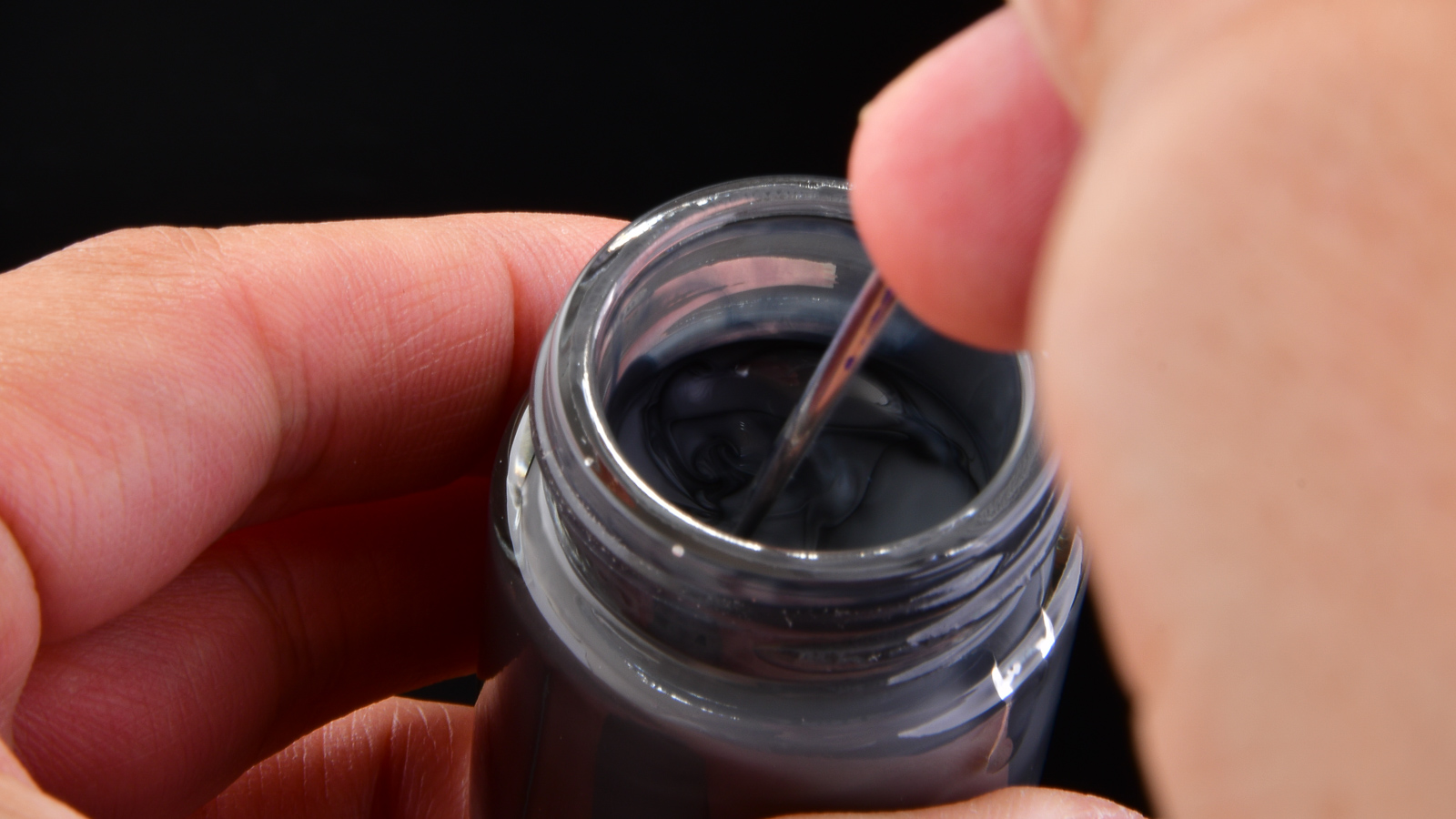 まず絶対にやらなけれんばいけないのが「撹拌」。超混ぜてください。いくら混ぜても墨黒みたいな状態なのですが、中の塗料は混ざっているので安心してください。塗料がしっかりと混ざっていないと塗った時に綺麗なミラー効果が発揮できません。
