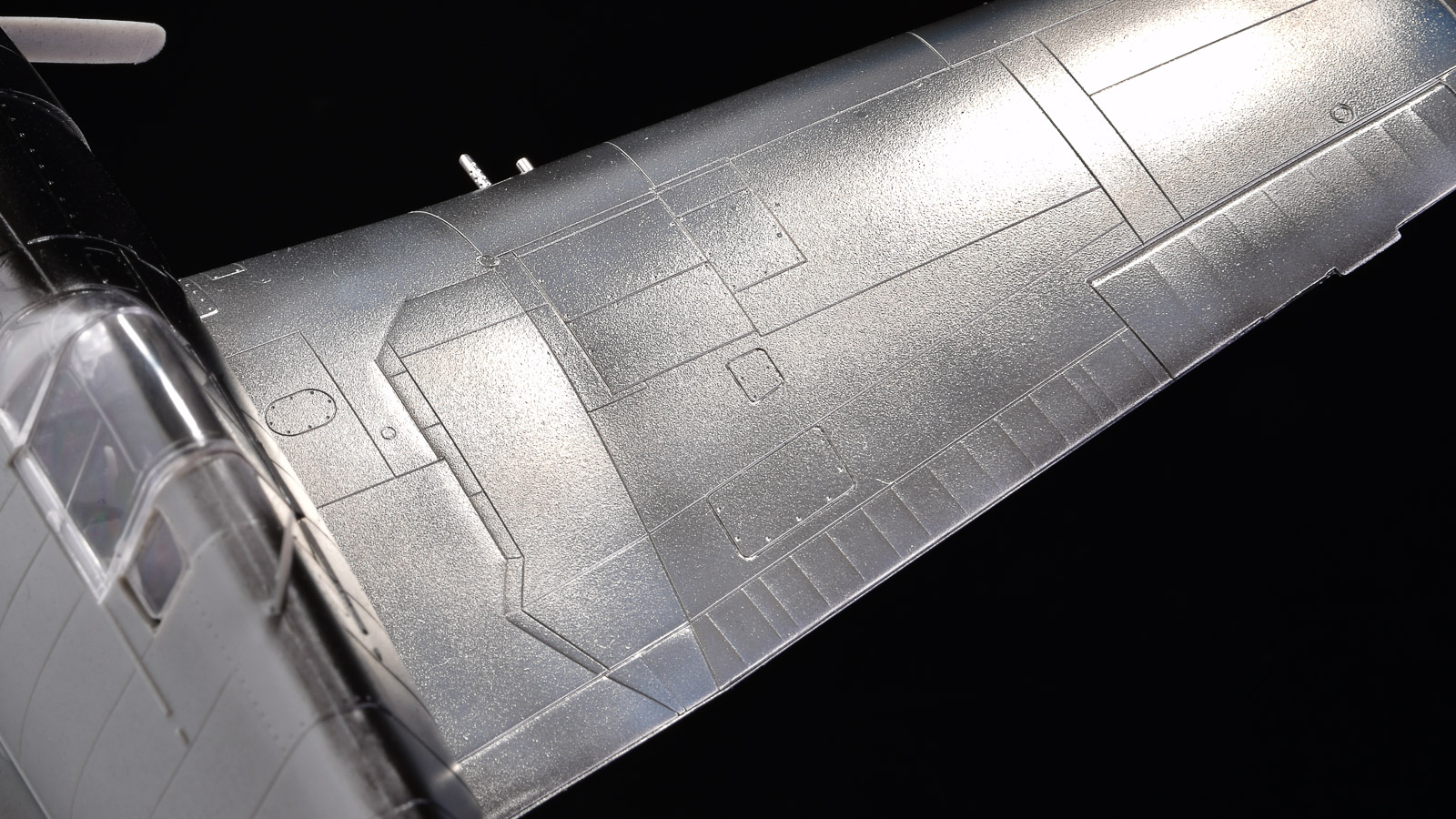 まずおすすめなのが、ツルツルのプラ地に直接吹くこと。パーツがツルツルならこの状態が一番成功します。もしヤスリなどで表面を磨いているなら、傷がほぼなくなるように高番手まで磨いて、パーツをツルツルにしてください。