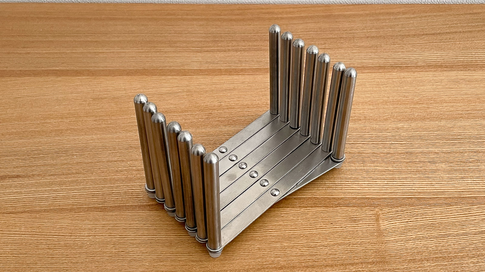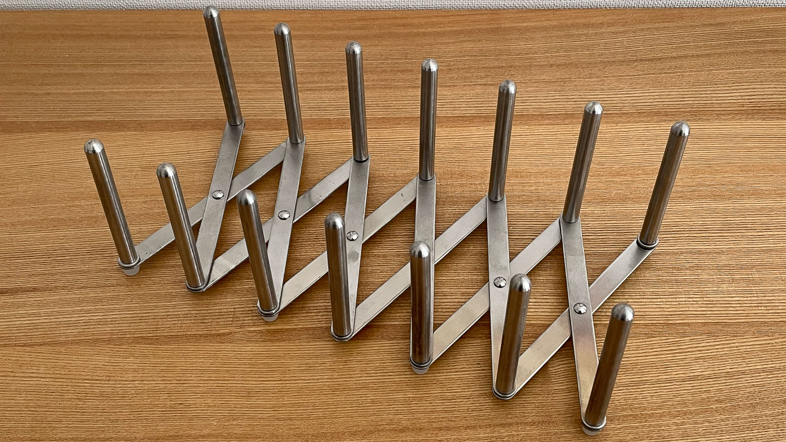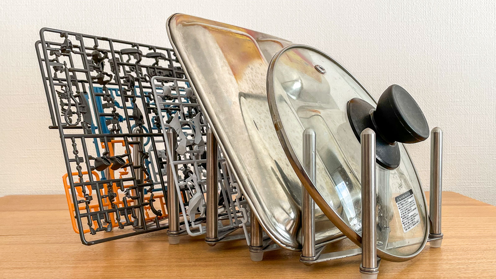 そういう時に自分が使ってる道具が、IKEAの「VARIERA」です。こういう、金属の棒が林立したような形をしている。当然ながら元はプラモデルの道具でもなんでもなく、「鍋ぶたオーガナイザー」なんだそう。今調べました。オーガナイザーだったのか、お前。