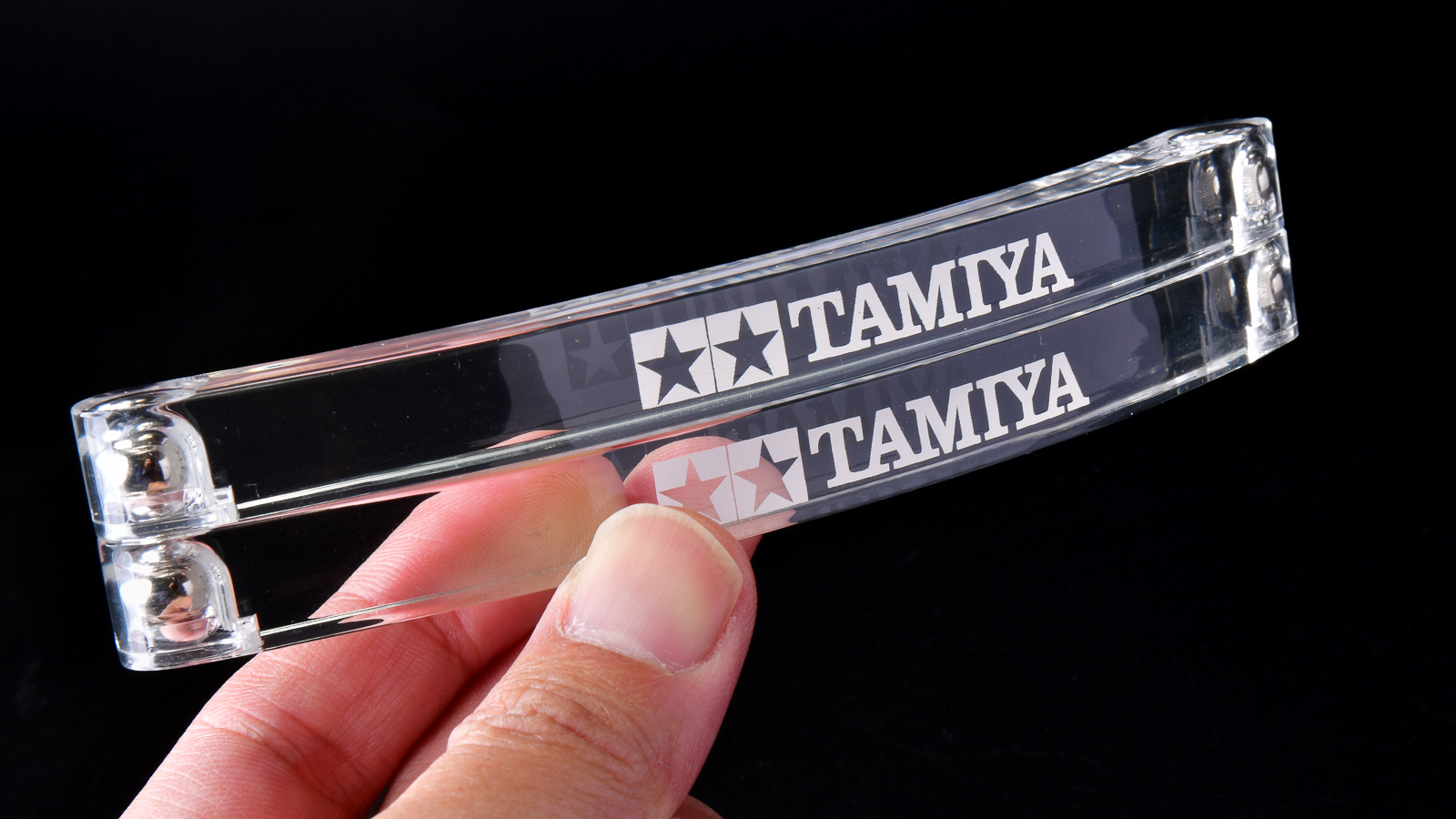 2024年末に開催されたタミヤフェアのグッズ売り場で遭遇した「タミヤクリヤースタンド」。美しいアクリルに「TAMIYAロゴ」がプリントされた超かっこいいマグネット式スタンドです。これがあるとプラモを組んだり塗ったりする時に説明書を立てることが可能なので、省スペースを可能とし、さらにかっこいいスタンドでテンションも上がるというナイスな効果も発揮してくれます。