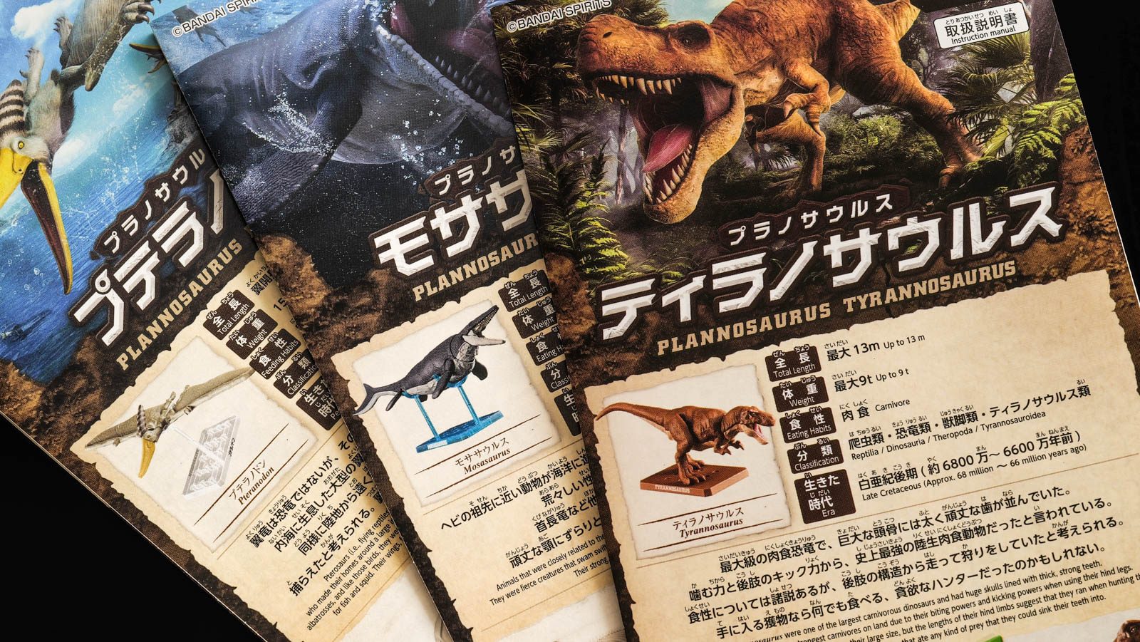 博物館に居並ぶ古代生物の骨。この景色が即座に手に入ってしまうのがバンダイスピリッツの「ラノサウルス 陸海空恐竜セット」です。プラノサウルスシリーズの#01 ティラノサウルス、#04 モササウルス、#07 プテラノドンがセットになった商品なんですが、このアイテムのために作られたペーパークラフトの背景紙がヤバい。