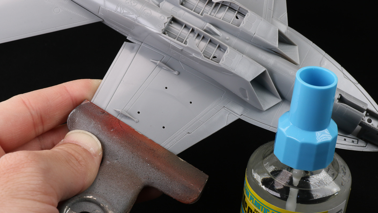 加工もそこまで大変じゃないし、ピッタリくるから安心してください。F-15やF/A-18を組んでて偉いなと思うのは、タイヤが収まる部分は脚を出し入れする瞬間にしか開かない(脚を出し切ったら閉じる)のですが、こういう些末なポイントもちゃんと再現しているところですね。