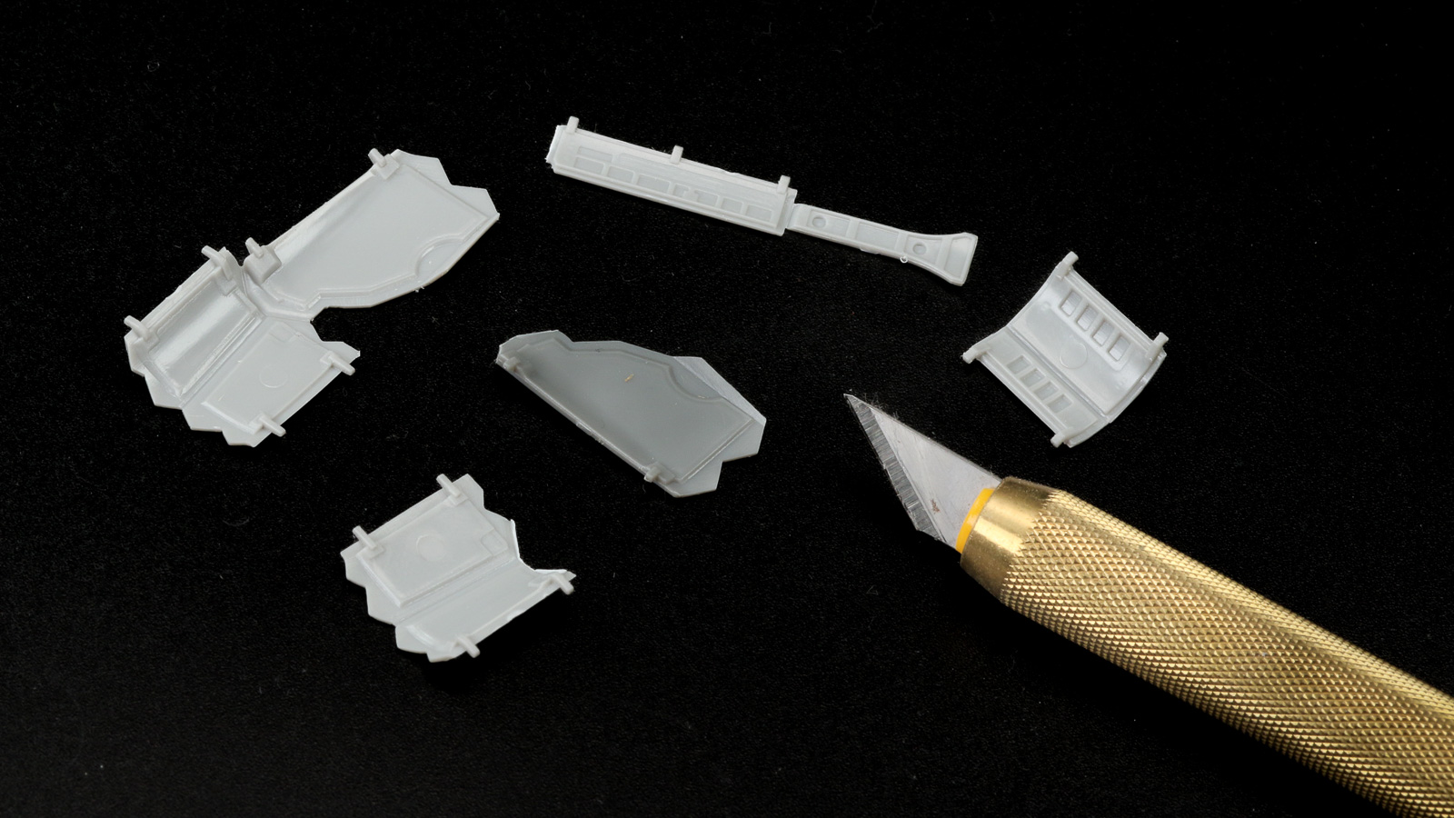 ドイツレベルのF/A-18Eは分割を抑えてシンプルに、しかしディテールはしっかり彫刻、という方針なのがよくわかるパーツです。前脚の収納庫を胴体下面と一体にしていたり、他のメーカーのスパホと見比べると「どうすれば組みやすくなるかな……」というのを考えた痕跡が見られてGOODです。