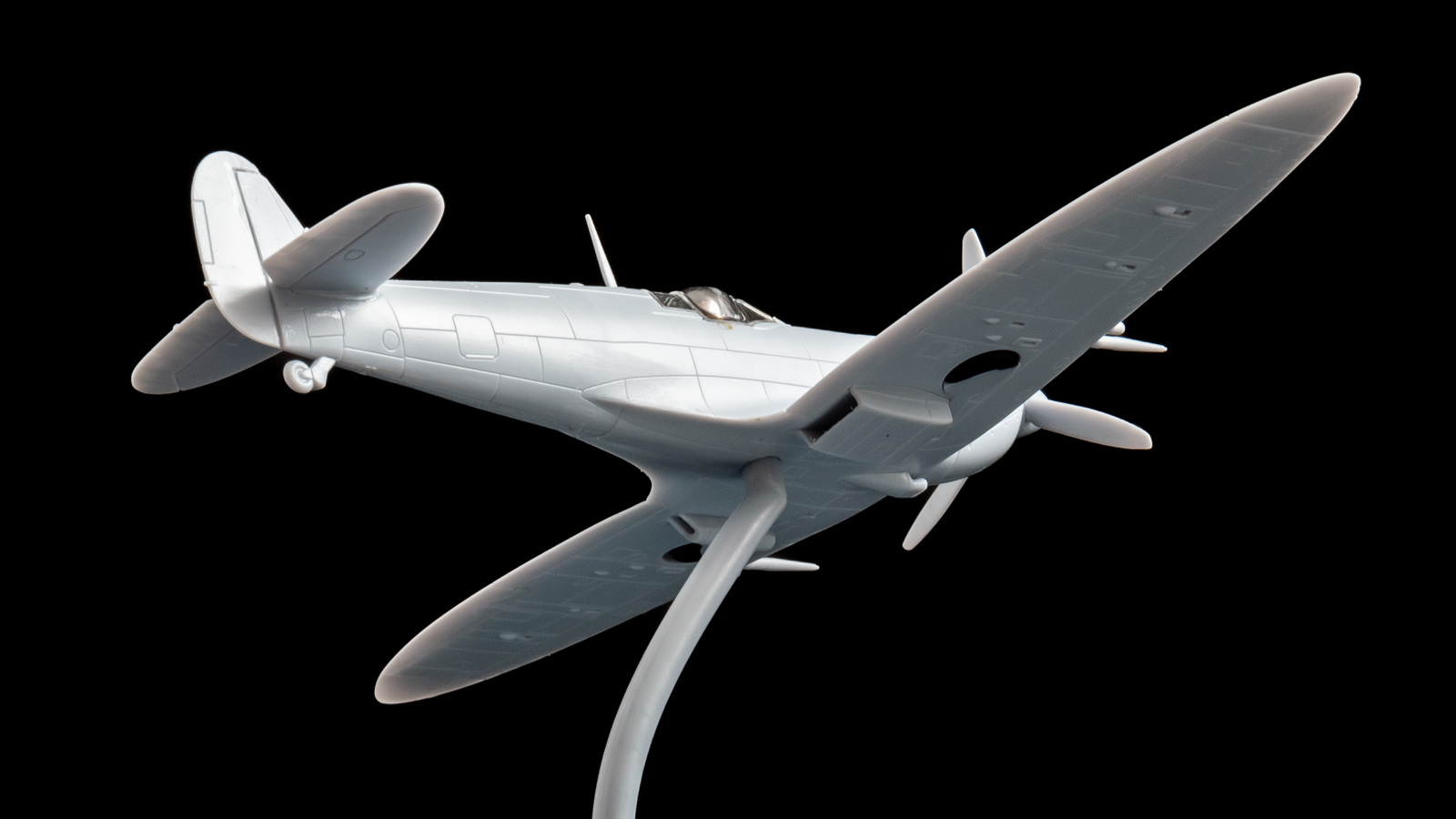 私が手にした「ベスト・オブ・ブリティッシュ」というプラモデルにはBAeホークといっしょにスピットファイアも入っていて、こちらにもシルエットを象ったディスプレイスタンドが入っています。こっちは台座上部から比較的素直にビュッと生えたアームが機体下面にブスッと刺さる仕組みなんですが、刺さる穴を自分で開口しなくても最初から重心位置にでっかい穴が空いているのが潔くて嬉しい。