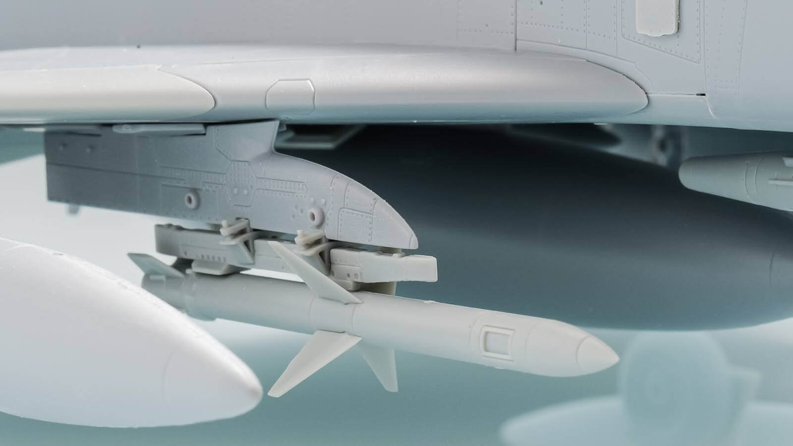 よくAIM-7スパロー(左から2番目、右から2番目のミサイル)の筐体を使って~という説明がされるAGM-45(左から4番目、右から3番目のミサイル)ですが、このF-4Cだと一緒に搭載することができます。こうすると、ふたつのミサイルが全然違うことがよくわかりますよね。1/48だからその違いが際立ちます。
