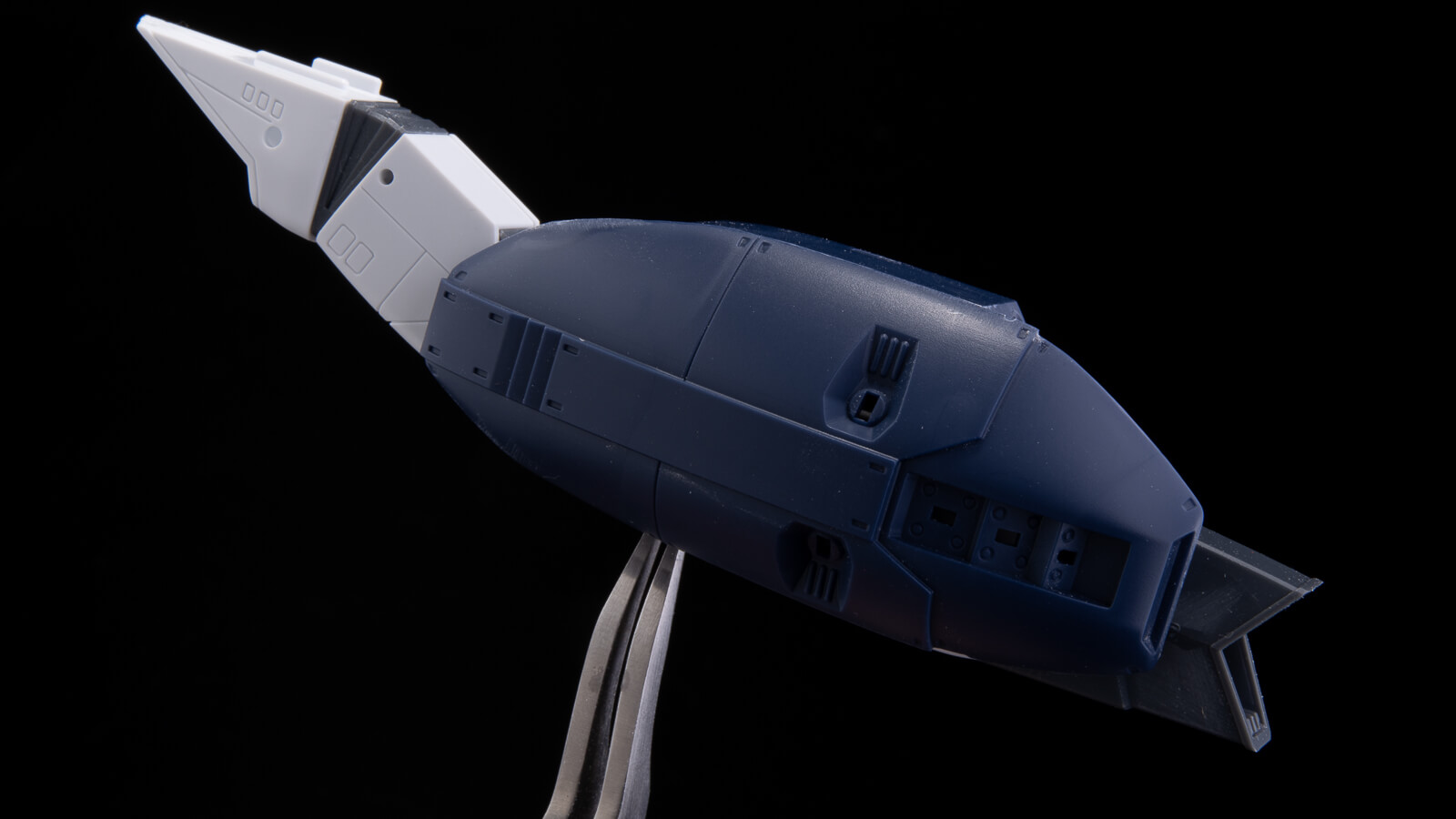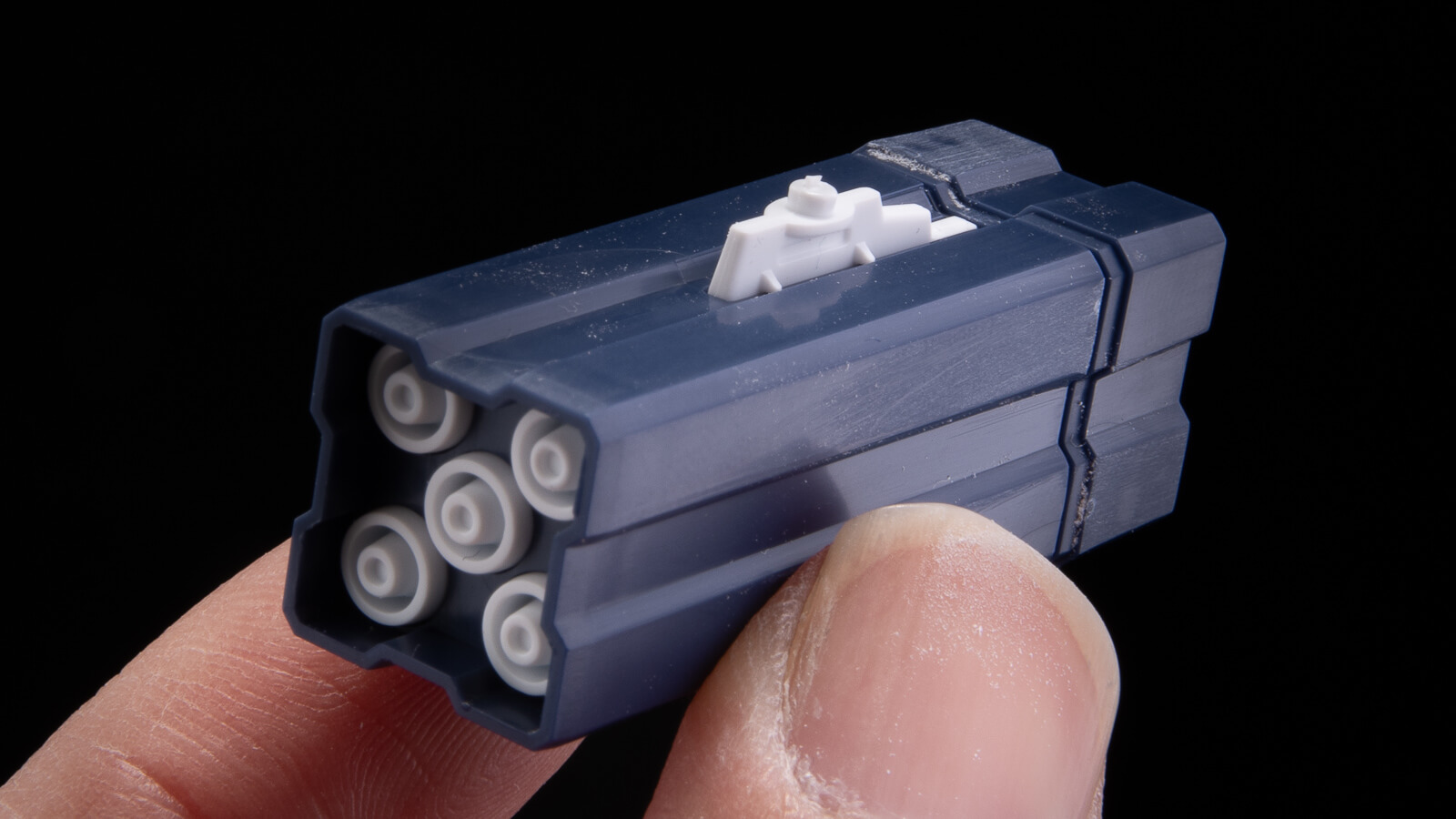 上面にはランチャー部分がピロっと出現。武装を取り付けるランチャーが桁と一緒に成形されていることで、コンテナが傾いたりせずに翼に取り付けられます。色分けも表現されていて素晴らしいです。