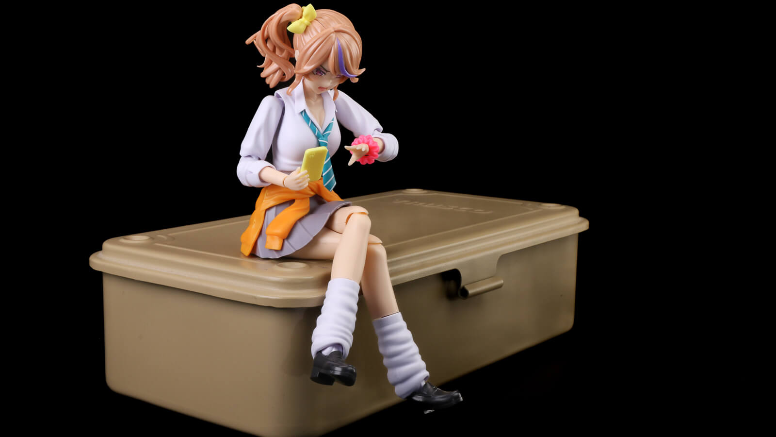 それまでの創彩少女庭園はしっかりした着こなしでしたが、彼女は違います。カーディガンを腰に巻き、シャツもボタンを開けたスタイル。ルーズソックスなんて懐かしい……って、最近レッグウォーマー的なものも含めて一部で見かけることもありますね。で、こういう細かい着こなしって布ならどうとでもなるんですが、プラスチックだとチャレンジの連続になります。