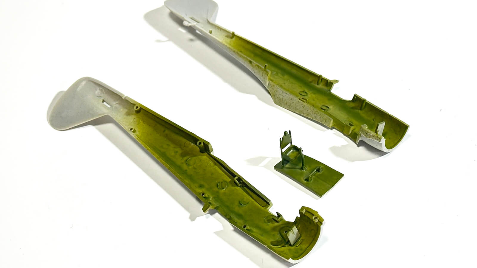 飛行機模型は、組み上げる前にコックピットや内部を先に塗装して仕上げておくことが多いです。組んだ後に塗ろうとすると、細部の塗り分けが難しくなったりします。その工程さえ突破してしまえば、全パーツ組んでも、いつでも好きなように外観の塗装を楽しめます。そしてフジミの隼のキットは、コクピット内部がとてもシンプルなので、先に塗る工程もそれほどヘヴィじゃありません。シンプルだからこそ、それらしく塗るだけでOKです。