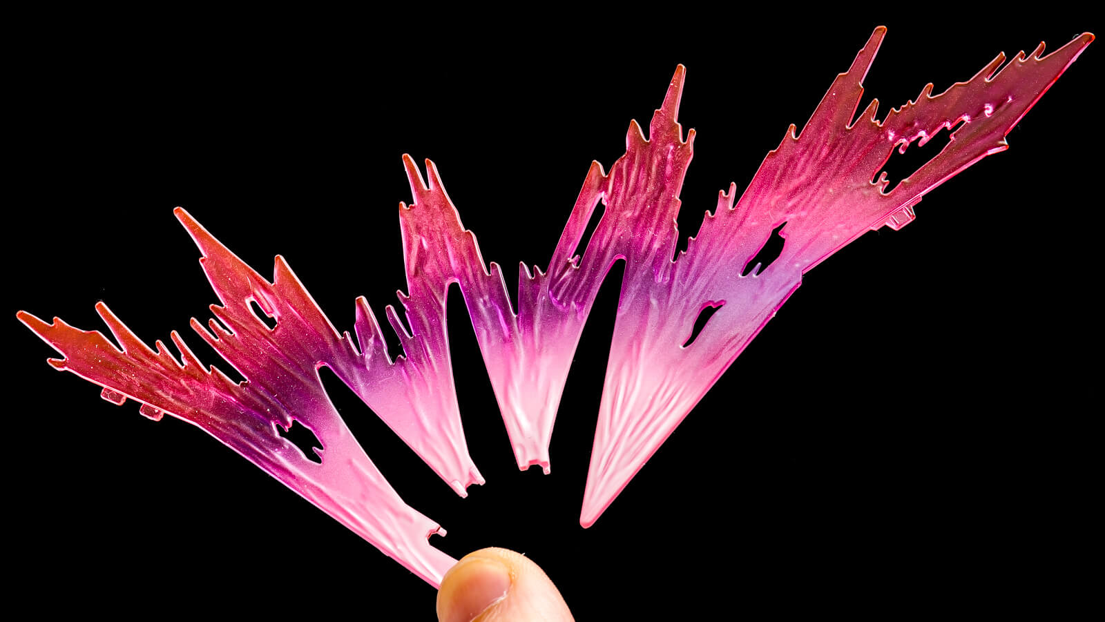 まず中心に近い部分を白、真ん中をクリアーパープル(クリアーブルーとクリアーレッドを足したもの)で塗装して、それから外周部にエアブラシでグラデーションが付くようにトランザムホロレッドを吹き付けます。光の翼のパーツは表面が真っ平らではなく、微妙に起伏のある形状なのでしっかりと虹が感じられます。