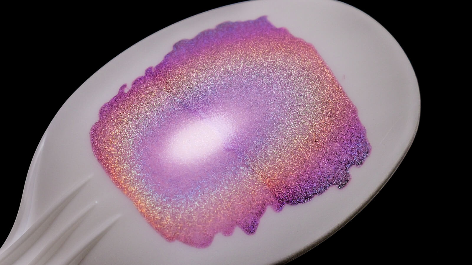 なので、モビルスーツの平らな装甲面にこのマーカーを塗ってもあんまり虹色っぽくならず、丸いスプーンのようなものに塗って、天井の照明や小さなLEDライトで照らすと反射した光源の周りに同心円状に虹色が現れます。