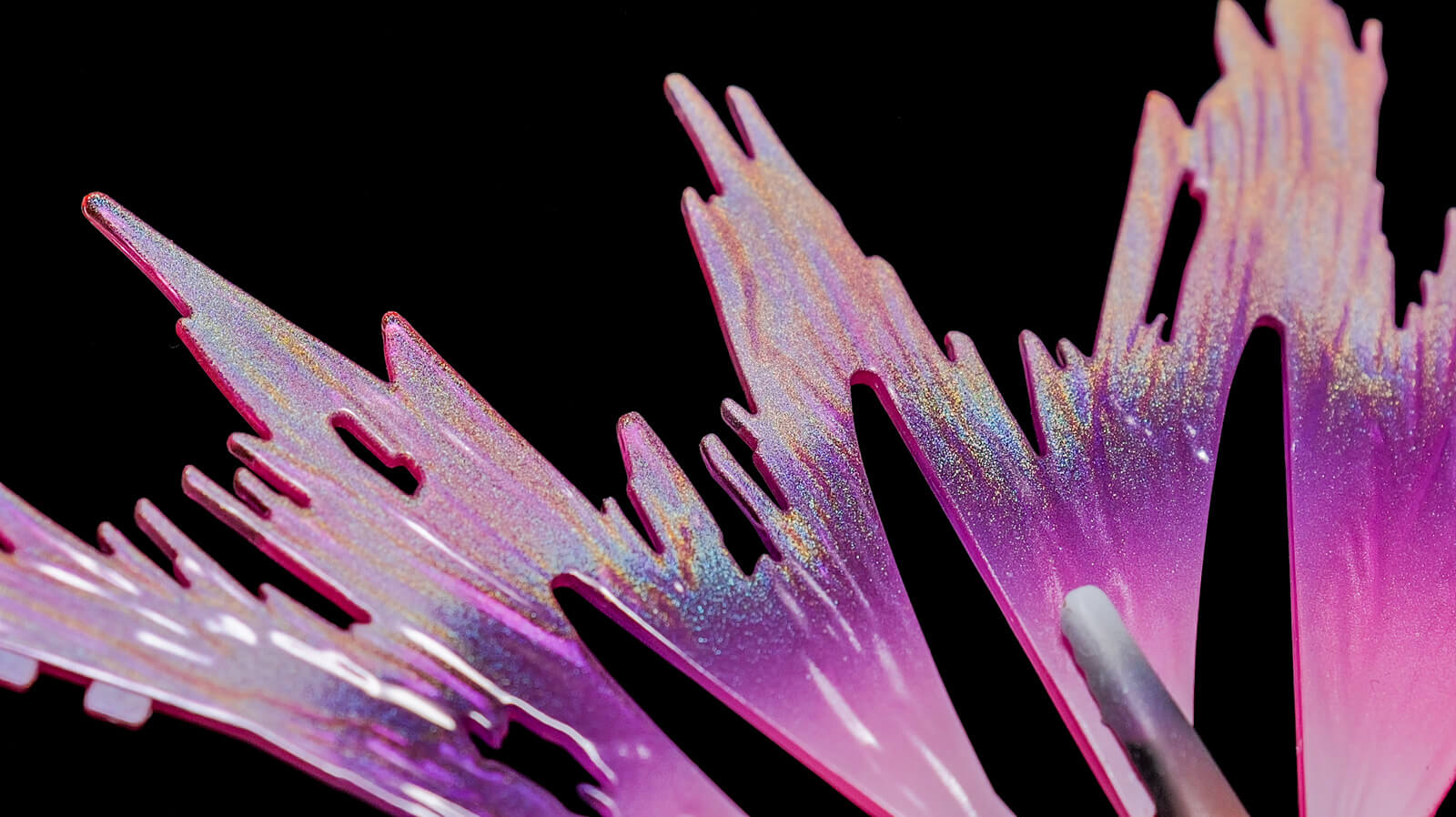 ストロボを天井や壁に反射させて全面に当たるようにライティングすると全然虹色に光らんのですが、光源が小さい光ならこの通り、バキバキに虹色に光ります。じゅうぶんに乾燥すれば指で触ったくらいで落ちない程度に塗膜の強度も出ます。それでも不安だという人は、水性のトップコート(光沢)なら虹色の輝きは失われないのでご安心ください。