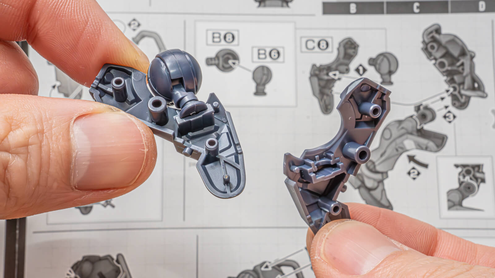 今回、股関の球型関節の受け側に凹状の部位があるのを見て「ゲート切り残しの逃げ(ゲート跡との干渉避けスペース)が設けられている!」と思わず目を見開いたのだ。ニッパーの刃が入りづらくゲートが残りやすい面なうえ、組み立てや可動に支障が出やすい部位に対して「注意!デザインナイフやヤスリでゲートの跡をきれいに切り落としてね」とユーザーに委ねることなく、工作精度のバラツキを見越した設計となっているのだ。加えて言うならば、メーカーがそこにコストをかけている。バンダイスピリッツの現在進行系のプラモデルには気付きもしない「ユーザーに工作熟練度を過度に求めない工夫」というものがパーツ設計に込められているのだろうな……と、意識させる一件だった。