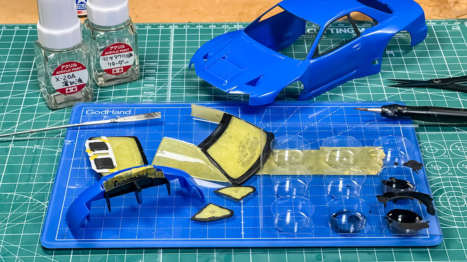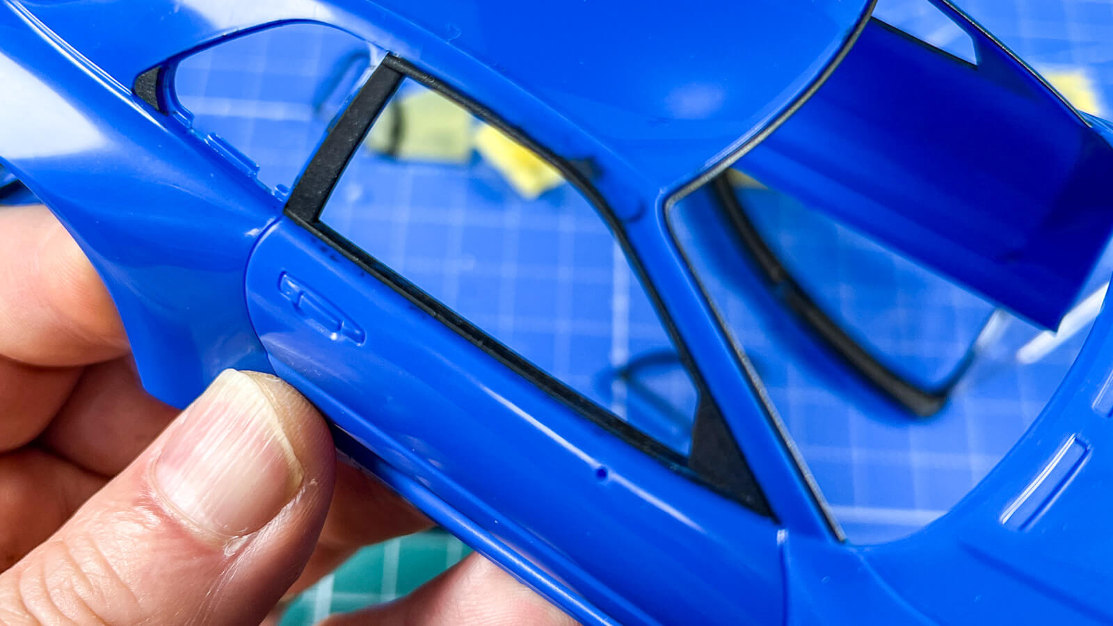 そうやって作業的に勢いに乗れると、いろいろ判断が早くなる。今回はボディは成形色、つまりプラスチックの色のままで作ることにしました。だってこのままボディ側の窓枠の黒を塗っちゃいたかったんだもん。成形色のカルソニックブルーがとてもきれいだし、塗っちゃったら絶版になるかもしれないこの成形色のカルソニックブルーとは今生の別れになってしまうから……。