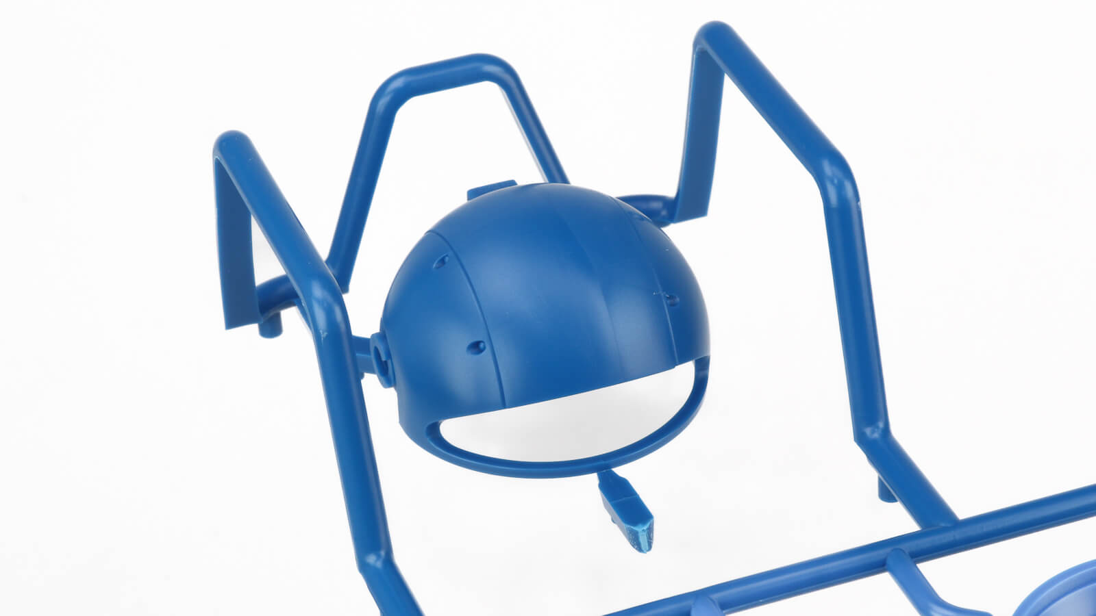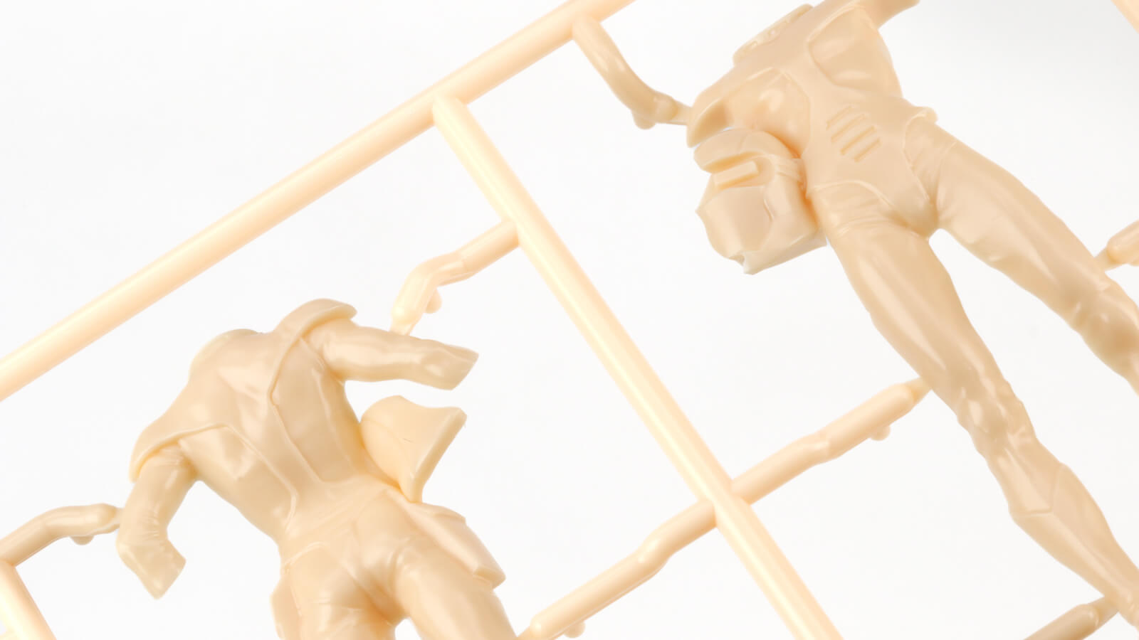 体のパーツに目をやれば、腰からヘルメットが生えていますから……。完成時に目立たない場所に合わせ目を追い込んだり、あるいはちゃんとヘルメットが抱えられるポーズとして作りやすいように。よりよい位置でパーツを分割しているんです。