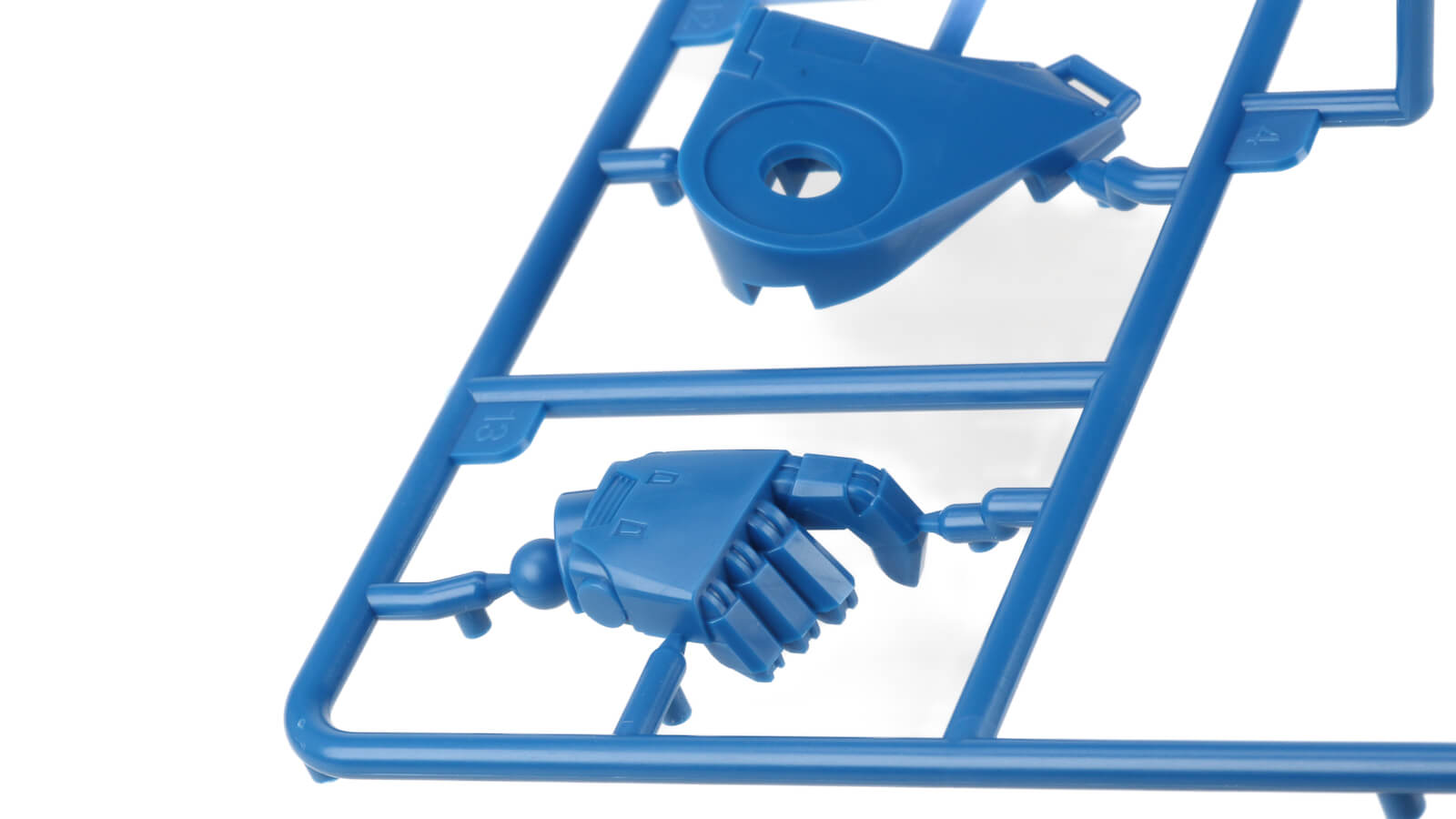 さて、実際のプラモデルに移りましょう。本当にプラスチックだ……。ストライクドッグらしい青い成型色に、設定画どおりの2本のライン、その付近に埋め込んだ留め具のようなモールド。スライド金型で埋め込み部分もしっかり真横に垂直から入れつつ、それでいてパーティングラインもない……これだけでご飯三杯のパーツですね。