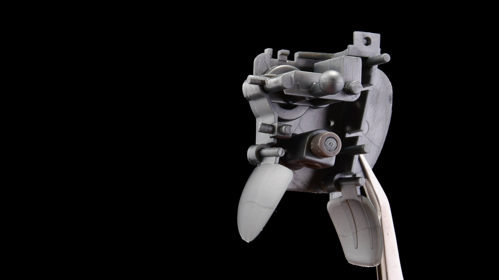 本キットは、スーツの中に軸や軸受となるパーツ、装甲パーツなどを挟み込みます。パーツの入れ忘れが無いように注意しましょう。同社のパーツオープナーを持っていると、簡単にパーツを取り外せるのでおすすめです(僕はよくパーツを入れ忘れるので、とってもお世話になっています)。