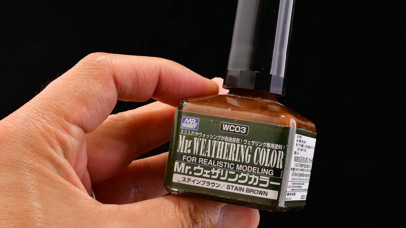 使用するのは模型塗料の中でも大人気商品である「Mr.ウェザリングカラー」。汚し塗装やスミ入れなどに大活躍する塗料で、多くの人から愛されています。その中のステインブラウンを木に塗るだけで、一気にリッチな仕上がりになります。