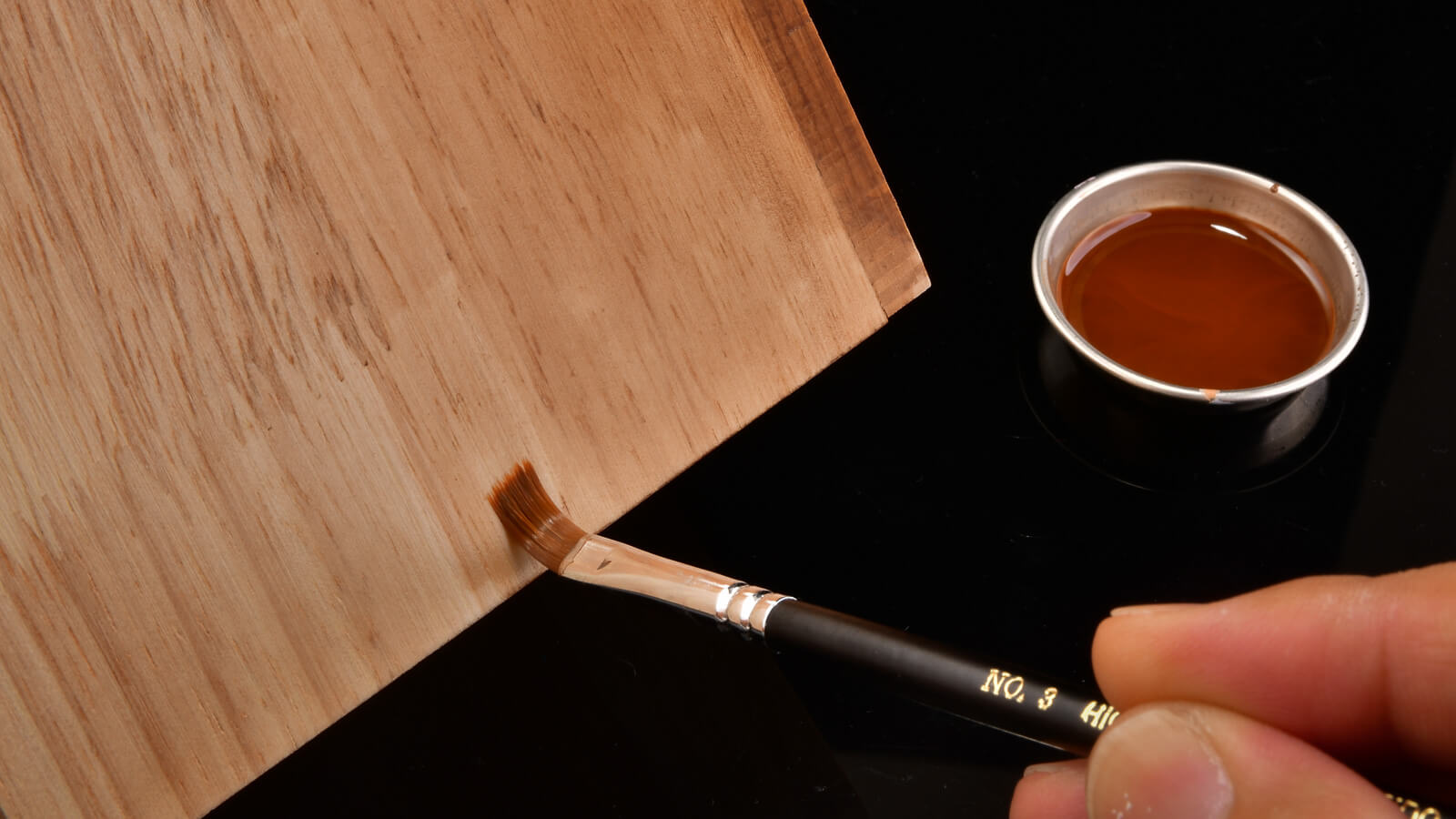 筆で塗ったら、キムワイプで塗料を刷り込むようにします。ポイントは木目に沿って動かすこと。木目にしっかりと塗料が入り、より表情が豊かになります。