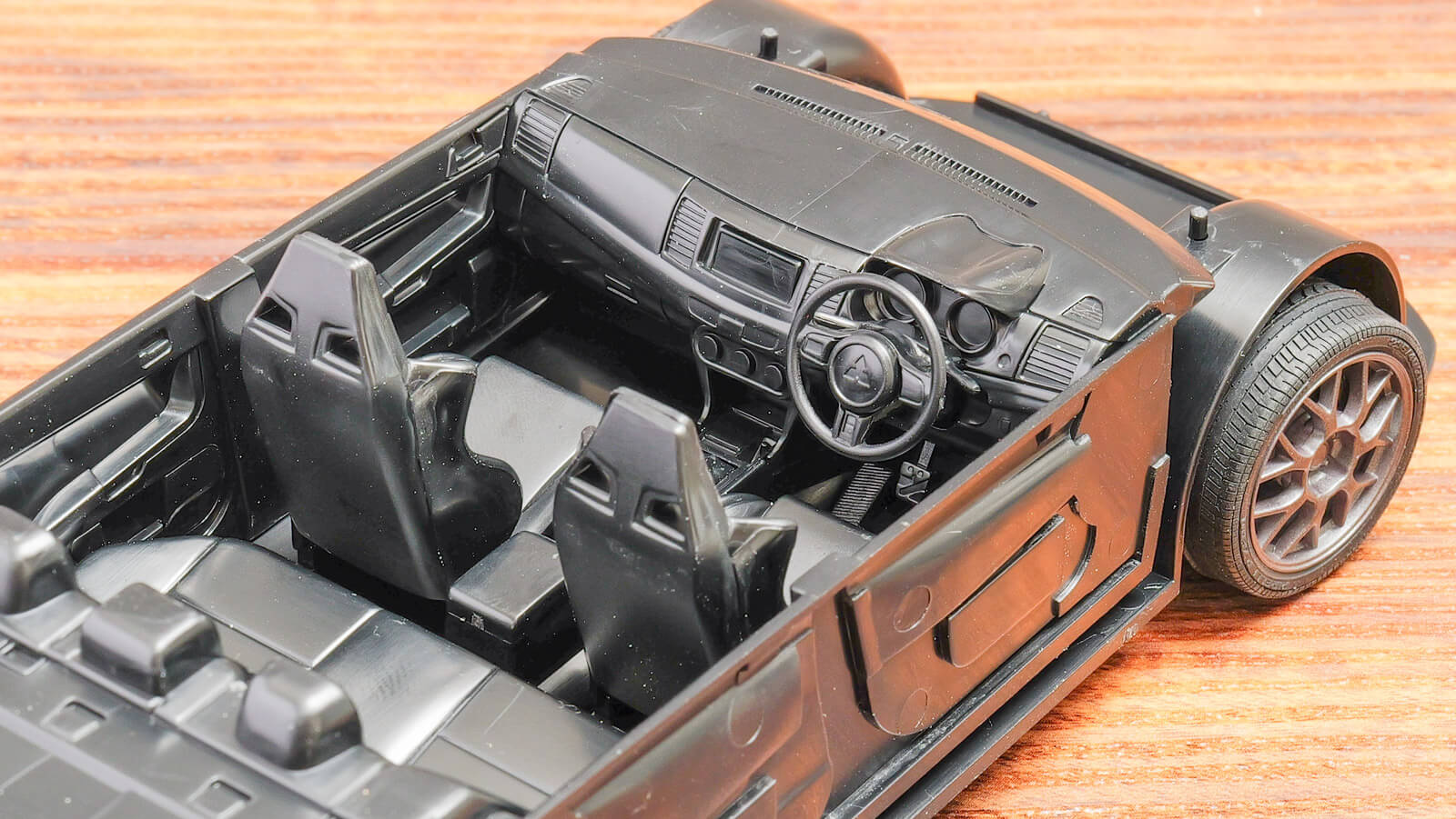 キャビンはカーモデルの標準的な構成ですが、どこもかしこもビシバシとパーツが収まり、こまかな塗り分けをしなければあっというまにカタチになる。そうだ、ホイールのパーツは白いプラスチックだったので指定通りガンメタルで塗装しておきました。自分の好きなところだけ塗ってもいいのよ。