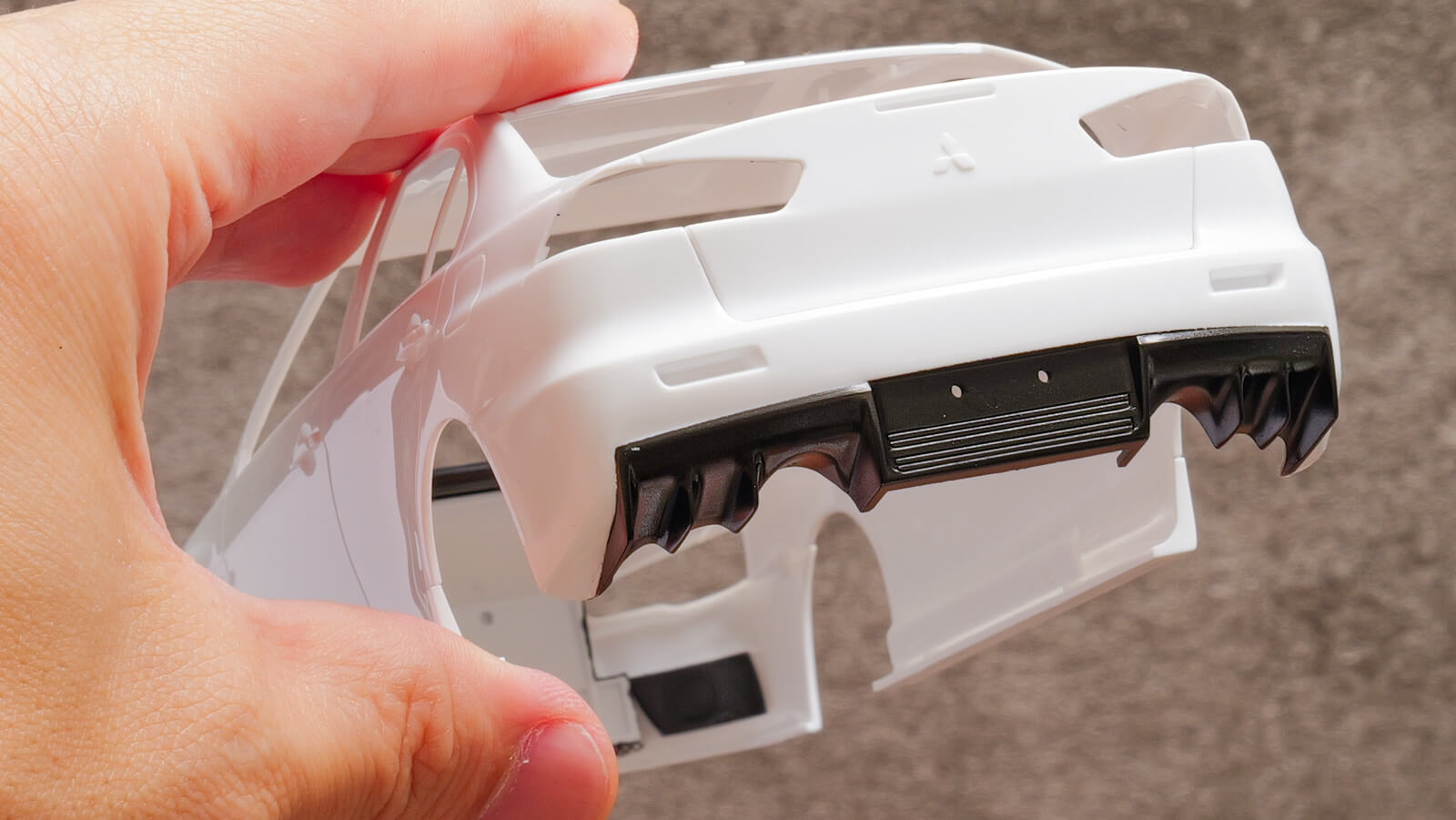 ボディはフェイスとリアとサイドシルが別パーツになっていますが、こちらもそれぞれ考えられた噛み合わせが用意されているのでアウトラインはビシッと合います。全部真っ白だとなんだかな〜と思ったので、リアディフューザーだけ黒く塗ろうと思ったのですが、これまた実車のデザインが功を奏してマスキングはたった3本のテープで完了。たしかにこのシンプルな塗り分けラインならわざわざパーツ分割しなくてもいいよね、と思えます。