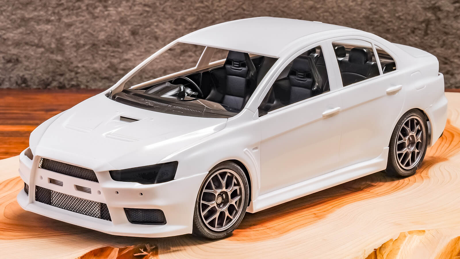 カーモデルはボディの色を仕上げてから灯火類や窓といったパーツを最後に取り付けたほうがキレイに仕上がります。しかし設計の都合や実車の構造上そうも行かないプラモデルもよく見かけます。アオシマのエボXはボディだけを仕上げて内側から灯火類や窓を取り付けられるので、普通に作るのにも痛車として仕上げるのにもすごく都合のいい構成。晩ごはんを食べ終わってから寝るまで、2時間ほどでクルマらしい姿になりました。