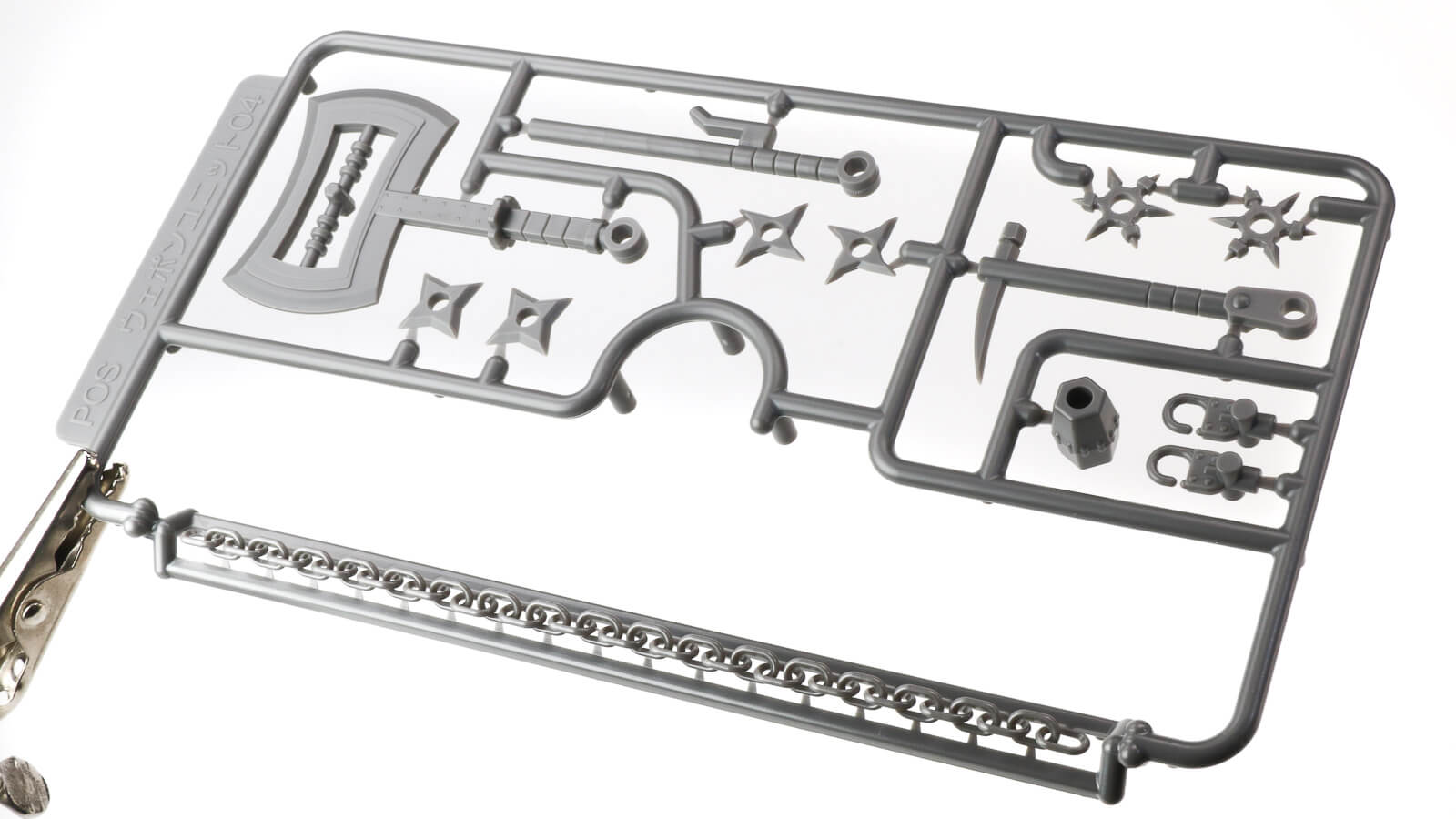 ランナーには手裏剣、十手、鎌など、ちょっとした忍者的な武器が揃っています。大きな一振りの手斧が最も目を引く……。