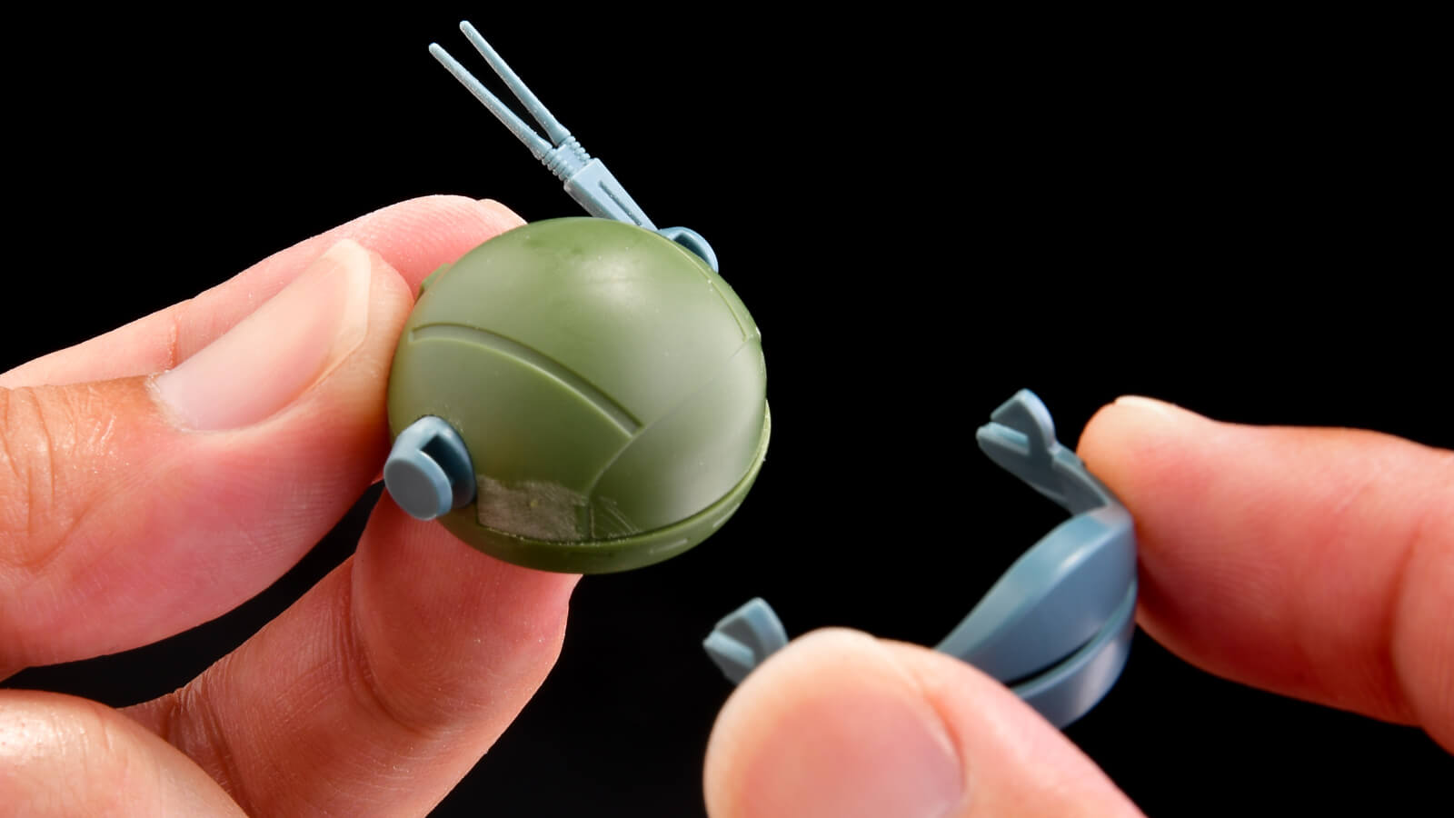 しかし、BANDAI SPIRITSのスコープドッグのバイザーは動きません。さらにバイザー奥も蓋がされていて、かわいいお団子みたいな頭部パーツになっています。「可動」を突き詰めるBANDAI SPIRITSらしからぬ選択に見えるのですが、ここには「外観完成への最短距離」と「パーツの取り扱いやすさ」を重視しようという意図が汲み取れます。この考えが可動とともに大きな柱となっているため、先ほど記した「動かしたい場所と動かなくて良い所の取捨選択のうまさ」につながるのです。