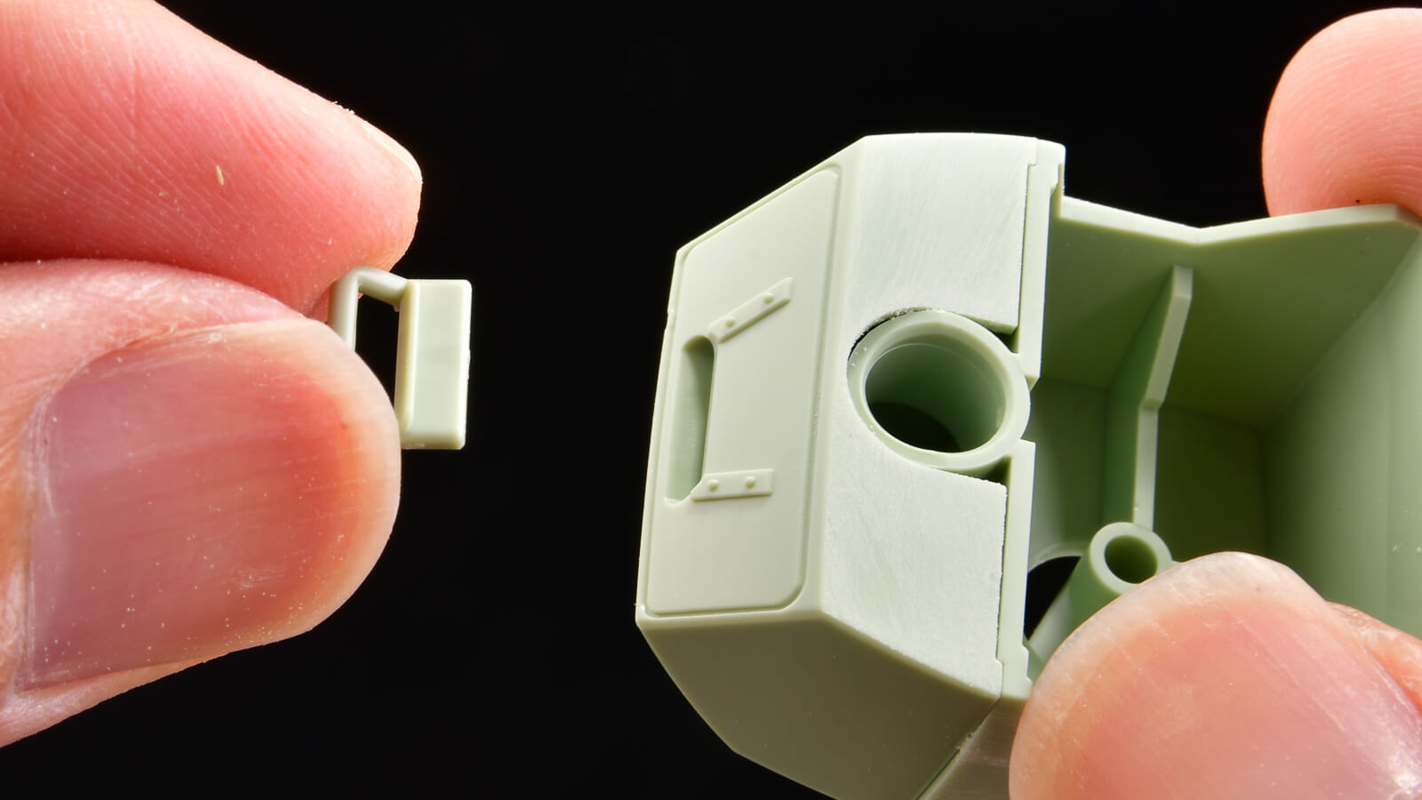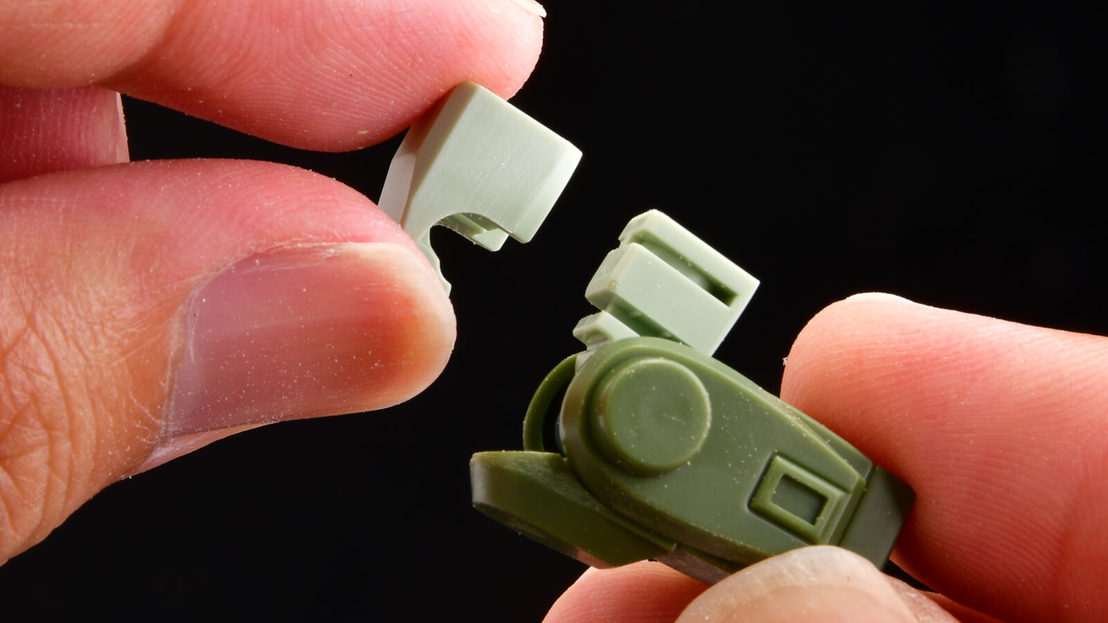 個人的に一番嬉しかったのが、地味ですが、腹部のフック。根元にデカい取り付けブロックが用意されているので、パーツ強度と取り付けやすさが確保されています。これまでの他社のプラモでは、フックの先に小さな軸があって、胴体の小さな穴に刺すという方式が取られていました。そのため破損しやすいパーツとなっていたんです。僕も何回も折りましたし、無くしました。でもこの方法なら簡単には壊れないし、無くしにくいです。