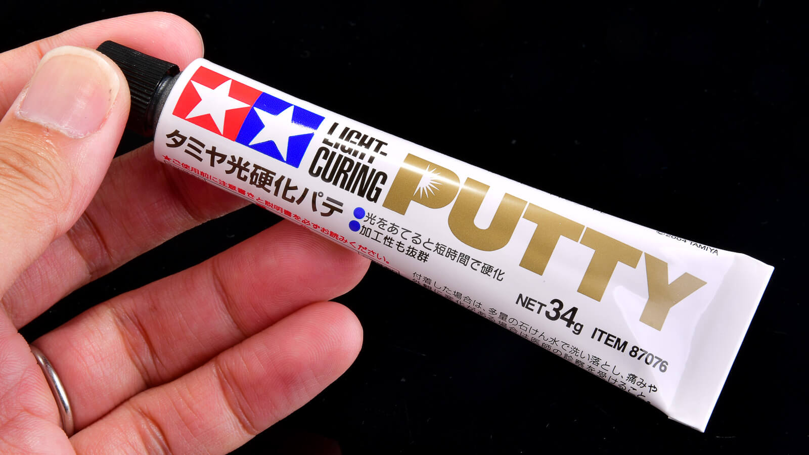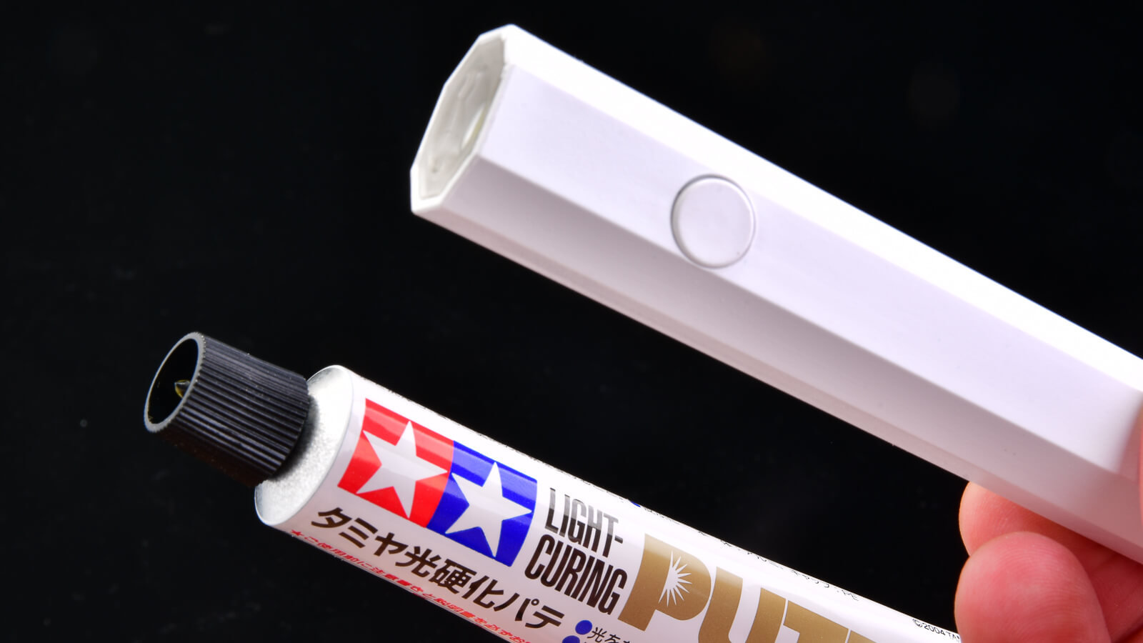 100円ショプのクラフトコーナーの隆盛のおかげで、タミヤの「光硬化パテ」が抜群に使いやすくなっています。「LEDライト」をゲットしてきてください。このライトを合わせるだけで、パテを盛った部分が爆速で硬化し、傷や穴を埋める作業を短時間で終わらせられます。とっても便利ですよ!