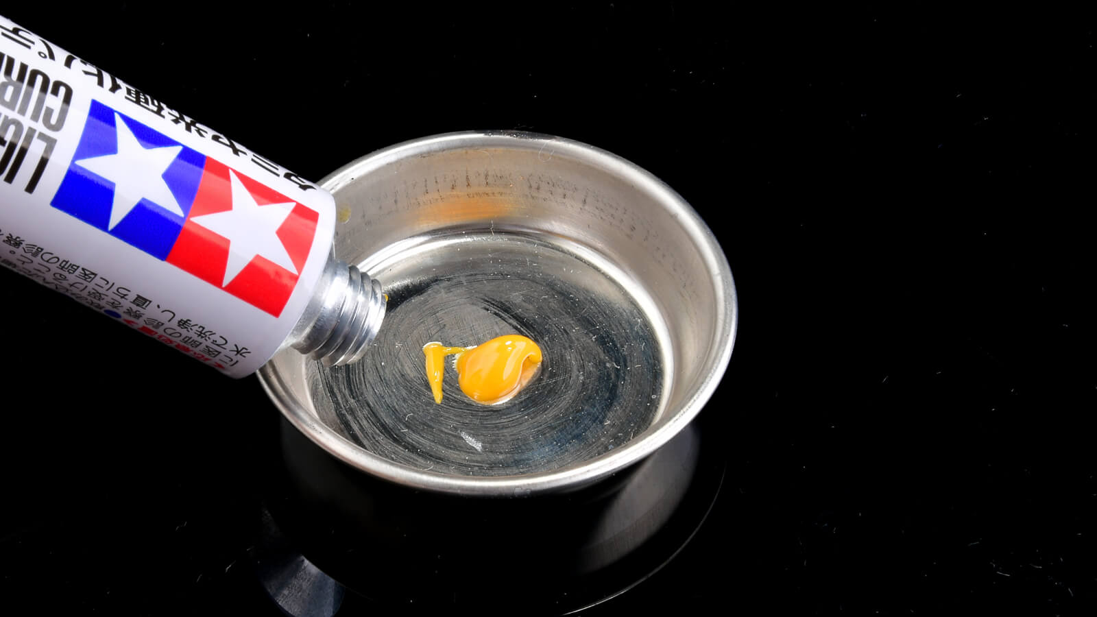 まずは光硬化パテを少量塗料皿に移します。オレンジの色味が特徴で、ケミカルな匂いもします。