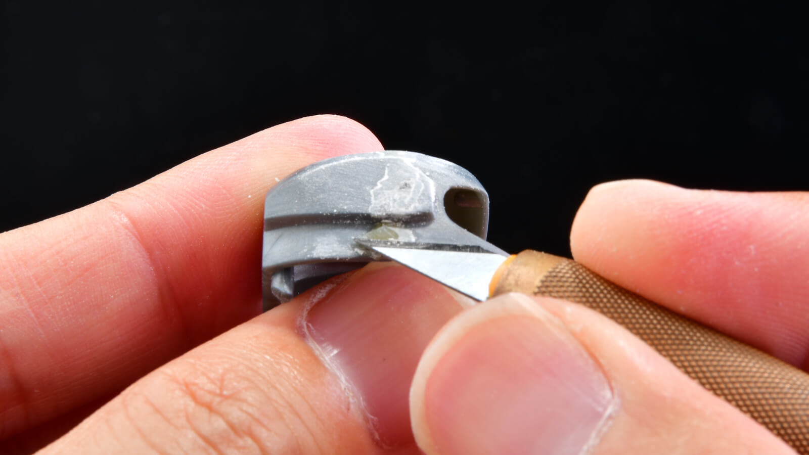 硬化したらナイフやヤスリで削り出しましょう。切削性もとても良くて、サクサクと削り出せます。やすりがけする時は粉も舞うので、マスクをして作業すると良いです。