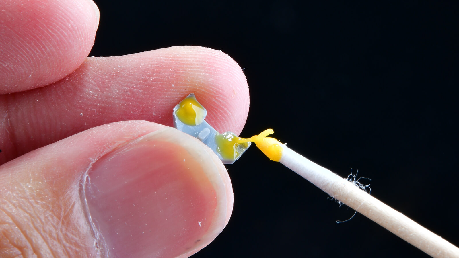 ツマヨウジや先細綿棒などで傷を消したい部分に盛ります。あまり厚く盛り過ぎると、硬化時間がかかるので、なるべく薄く盛ります。厚く盛りたい場合は、「薄く盛って硬化→再度盛って硬化」という手順を繰り返しましょう。