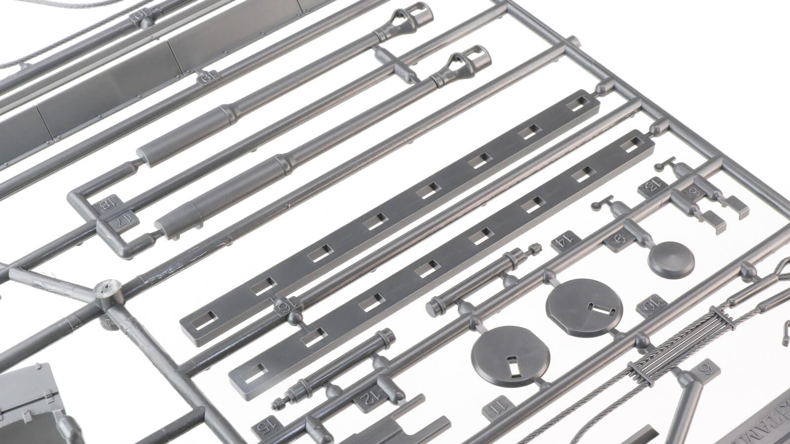 組み立て面でもやはり進化が鋭く、サスペンションアームを整える治具が入っていたり、組み立てで間違いのないように裏にパーツのナンバーを入れたり、ダボを工夫して左右を間違えると合わさらないようにしていたりと、かなり親切な設計になっています。履帯も接着剤でつけられるという簡単なものを取り入れて、複雑な足周りをなるべくシンプルに組み立てられるようにしています。