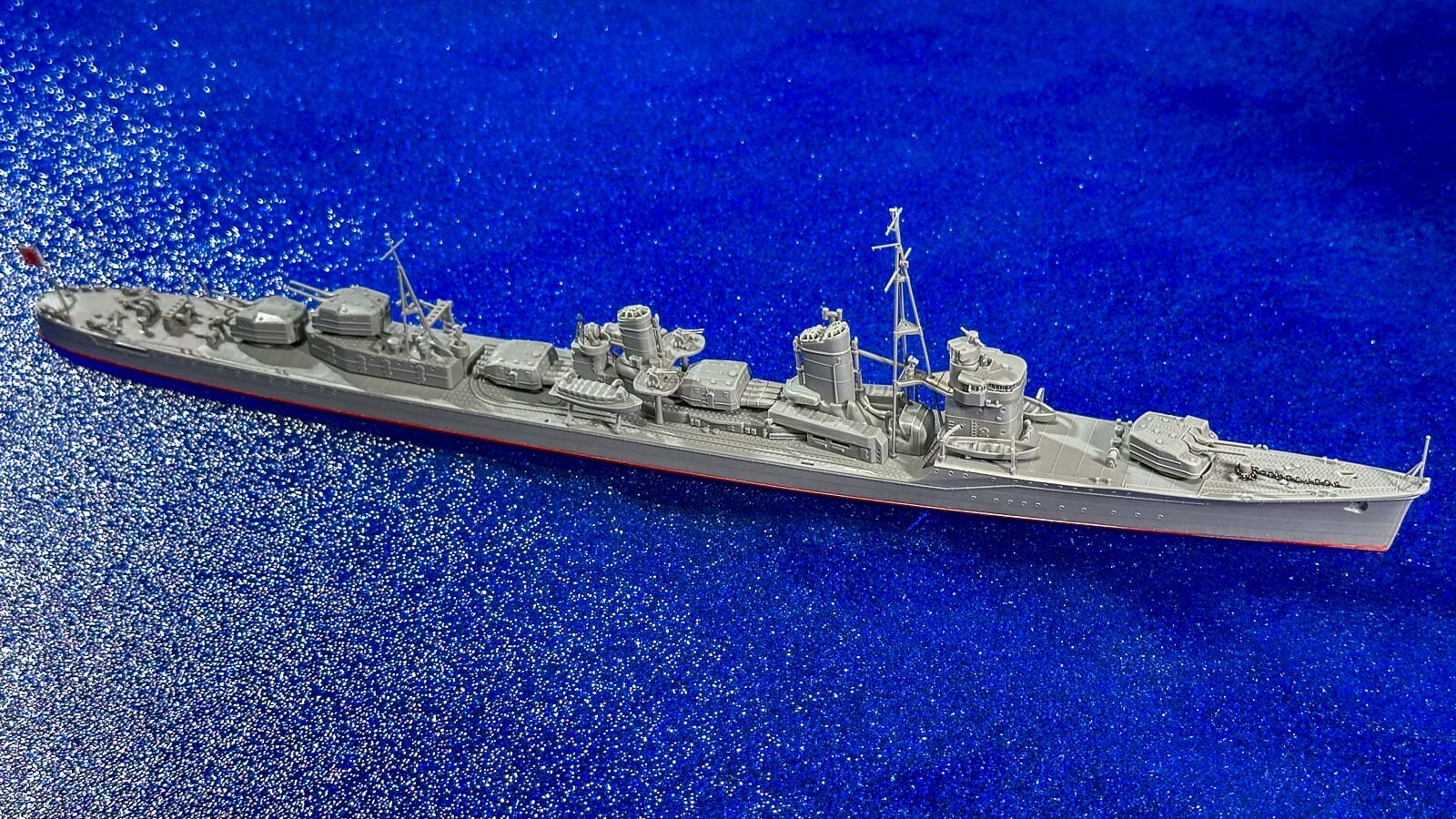 艦船模型における「ウォーターライン」というシリーズは、喫水線から上の部分だけを表現しているモデル。なので組み立てただけで「海を感じる」楽しいモデルなのです。ウォーターラインに艦底が接している、あなたの机、棚はまさに海なのです。だからちょっとだけ工夫してあなたなりの海を表現してみると、さらに楽しくなりますよ!