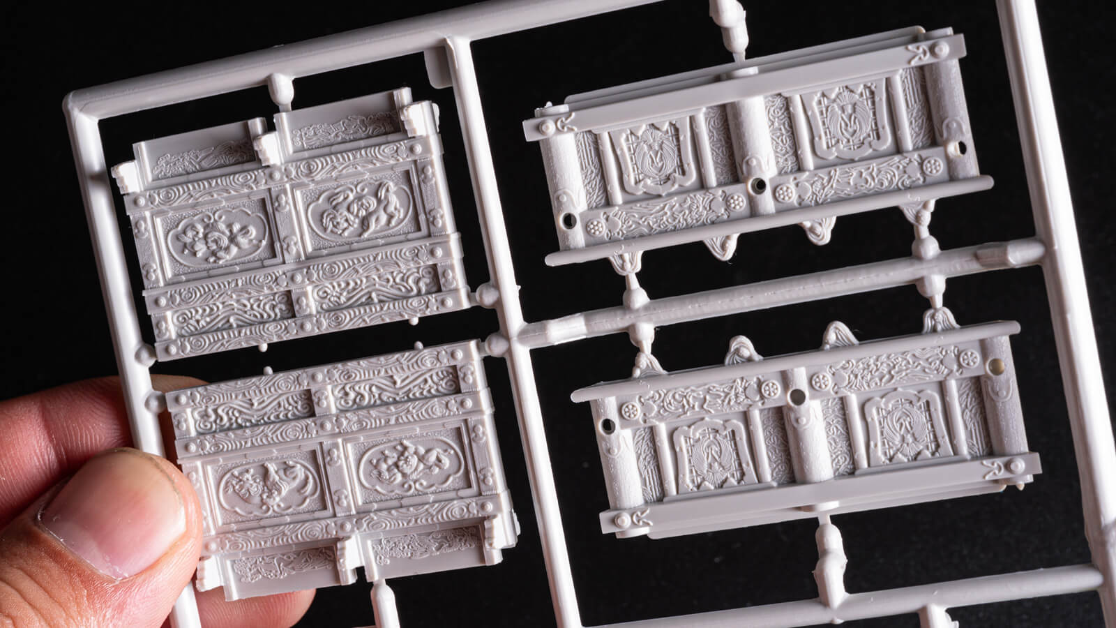 壁パーツの「彫刻の彫刻」が精緻すぎる。実物の彫刻を完全にトレースしている訳ではないが、面積あたりのディテール密度でいえば、プラモデルがホンモノに勝っているだろう。
