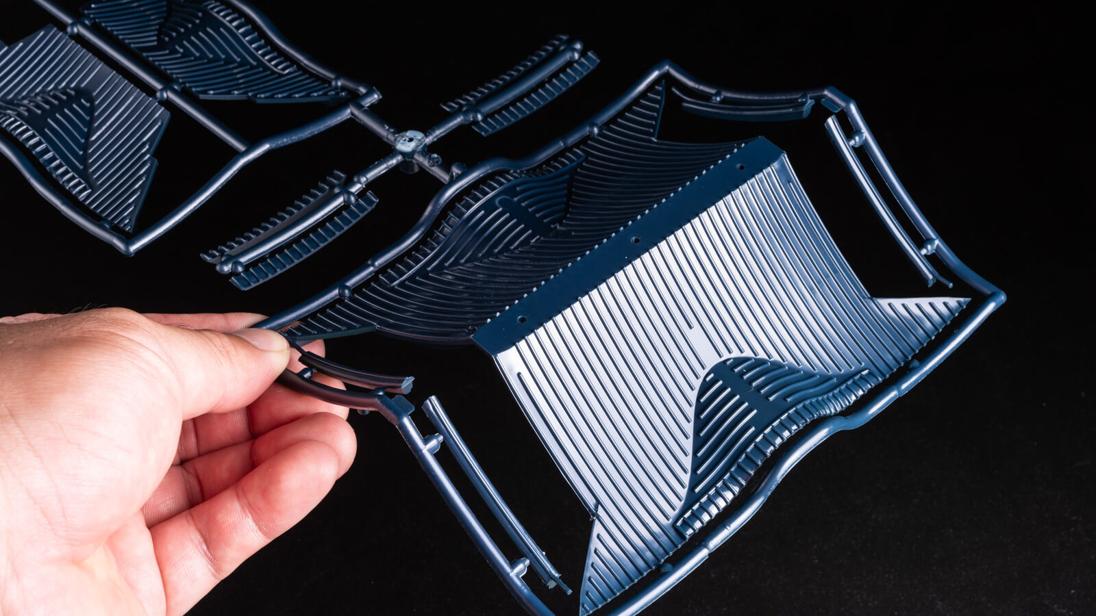 後光のように美しい垂木の造形。嘘のようにワンパーツで成形された桝組。それらが驚くほど輝いている。なぜなんだ。塗装されているのかと思ってランナーを削ってみると、ラメの入ったキラキラした削りカスが出てくるだけ。まさかの成形色の輝き!仏倫仏倫(ブリンブリン)だ。