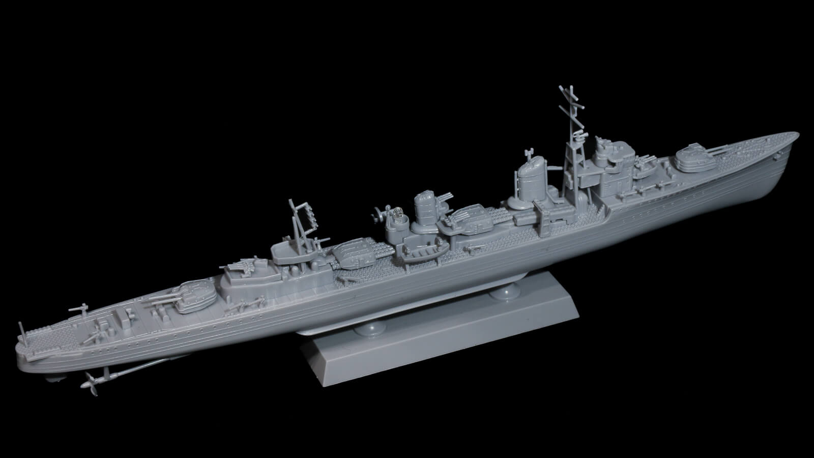 同じ1/700でも、後ろを見れば水中にあるスクリューが見える。これだけで全然印象が違うものです。中央部の四角い船体から、艦首ではちょっとつまんだようなもっちり形状、艦尾にもすらっと伸びる曲線。船体の曲線美をこれでもかとアピールしていますね。