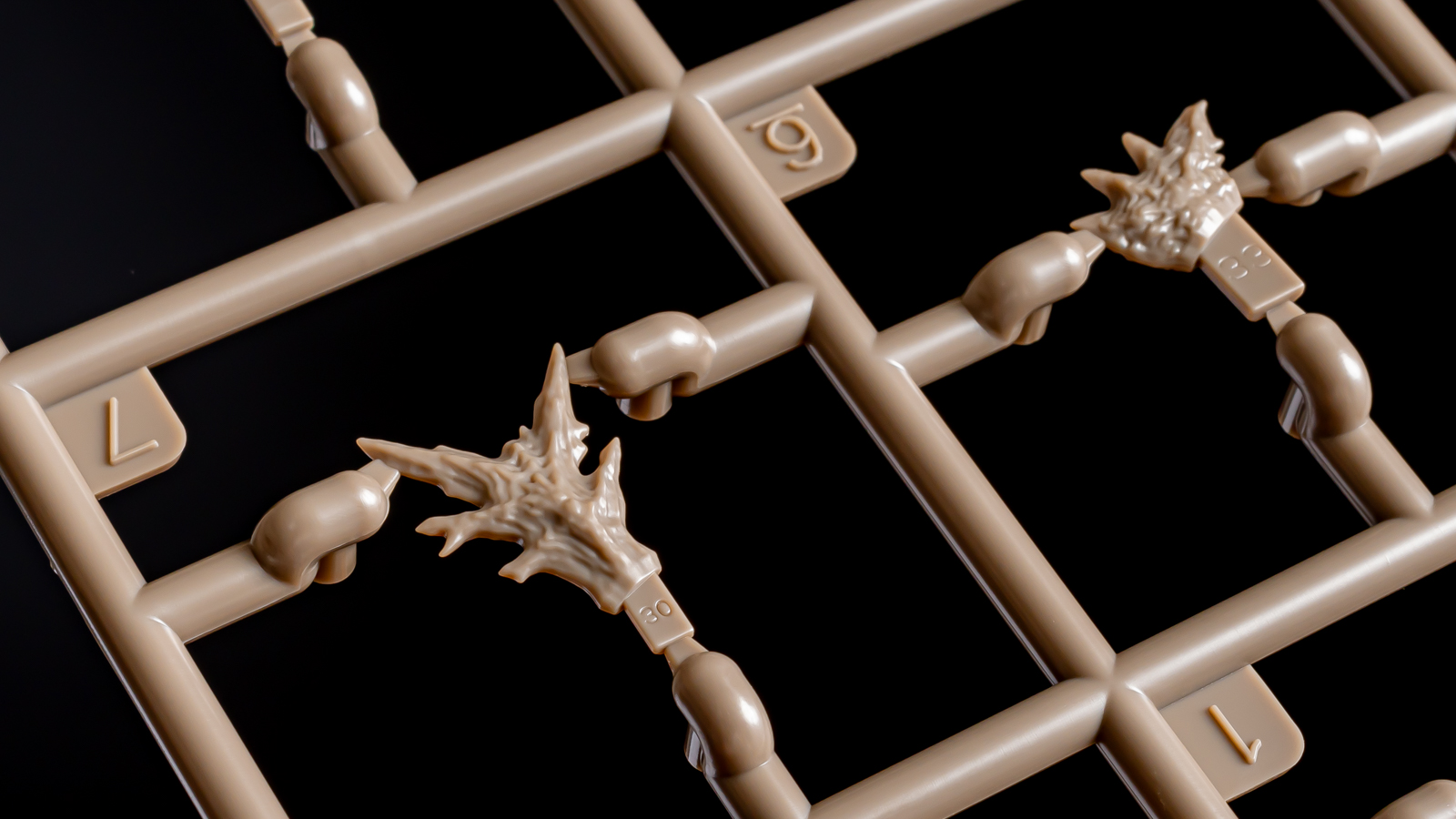 2枚のランナーに大小都合38枚の背びれ。それぞれカタチは違いますが、パーツを切り離してしまうとどれが何番なんだかわからない。一応背中の穴に取り付けるためのダボの形状は向きや位置を間違えないようになっているのですが、パッと見でそれを判別するのは不可能。ということでそれぞれのパーツのダボには小さな番号がこくいんしてあります……って、なんで7番のパーツに「30」って彫ってあるんだ?