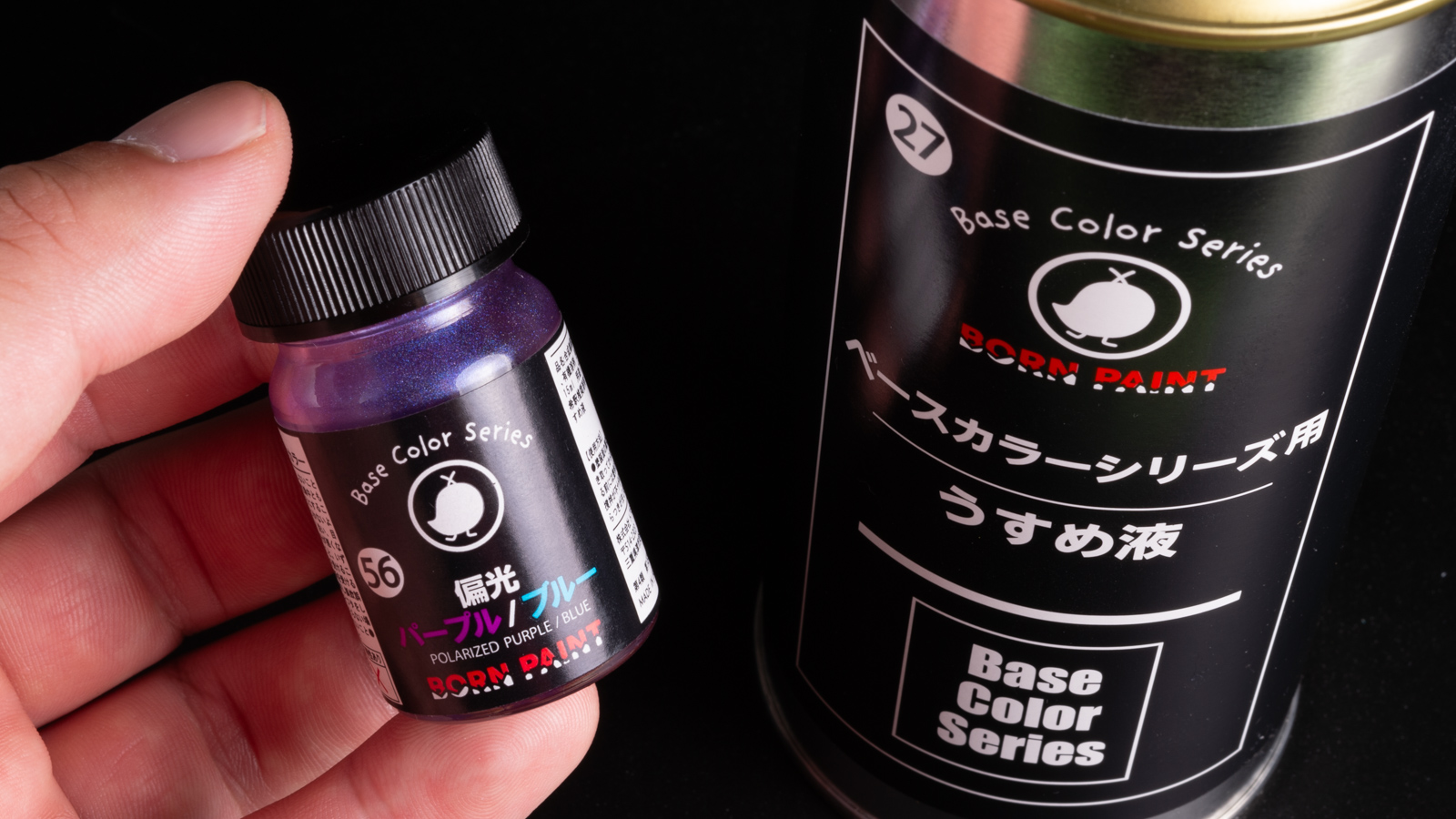 劇的な偏光ではなく、ゆらめくような偏光の輝き、美しさがあります。下地の色、そして光の当たり方によって紫と青がゆらゆらと表情を変える塗料、それがボーンペイントの「偏光パープル/ブルー」です。