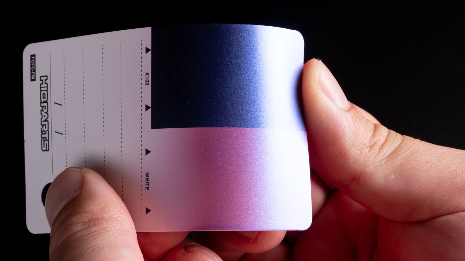 結果は上々です。銀下地はグレーに近いせいか、白下地よりも濃いパープルに発色しました。光を反射する部分は、チラリと淡いブルーの光を放っています。ただ、曲面が細かく散在している造形のためか、パッと見てわかりやすい偏光感は生まれませんでした。車のボディのような緩やかな曲面であれば、もっとわかりやすいグラデーションになったと思います。しかし、これはこれでとてもGOODです。