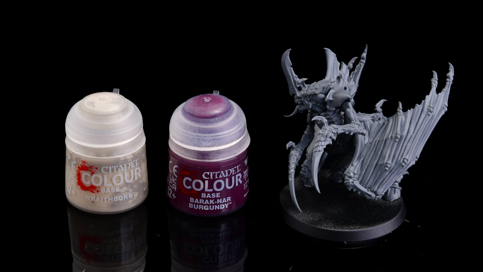 これまでの号で付属してきたスペースマリーンとティラニッドの色が付属します。ティラニッド用に、アイボリーな色合いの「レイスボーン」と、紫色と言える「バラク=ナール・バーガンディ」。