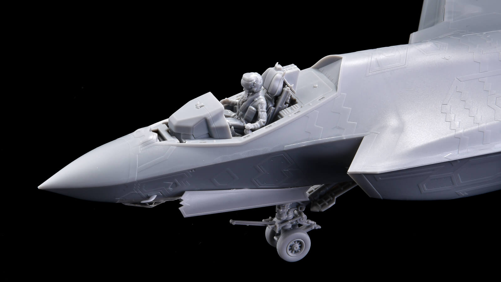 この未来的形状のパーツは、お腹側に搭載されるステルス性を備えたガンポッド。最新装備に触れられるのも、最新鋭機のプラモならではですね。