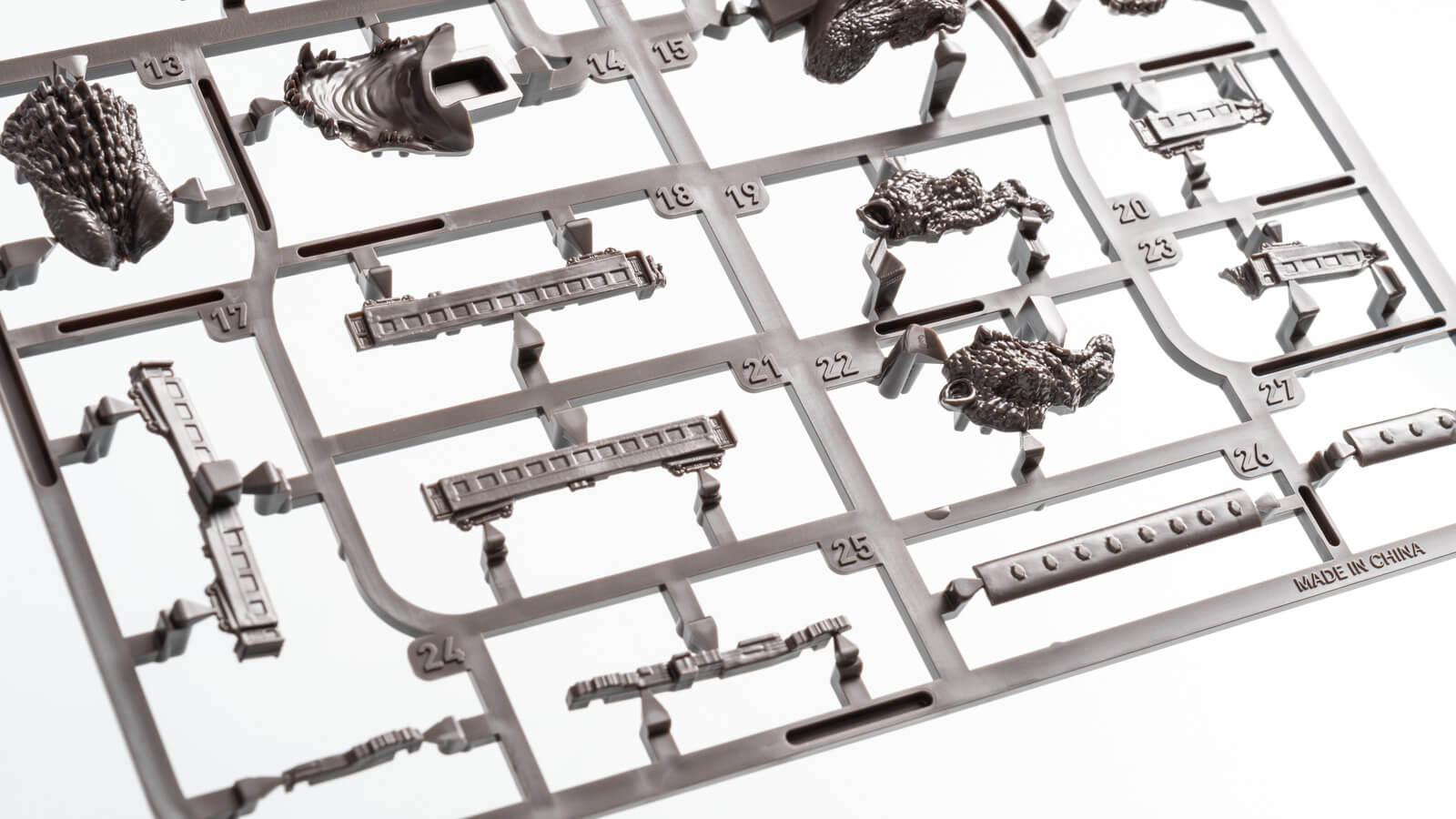クチに2両も咥えているのに手でも1両持ってこちらを睥睨、「旧客美味しいです!」と言わんばかりのゴジラ氏。ダイナミックなゴジラの造形とパーツ割りに対し、小さくとも抜かりなく分割してあらゆる角度から鑑賞できるように設計された客車によって「巨大生物とちっぽけな人工物の対比」が見た目にも組み味的にも脳髄を直撃するレベルで伝わってくるのがめっちゃいいんですこのプラモ。