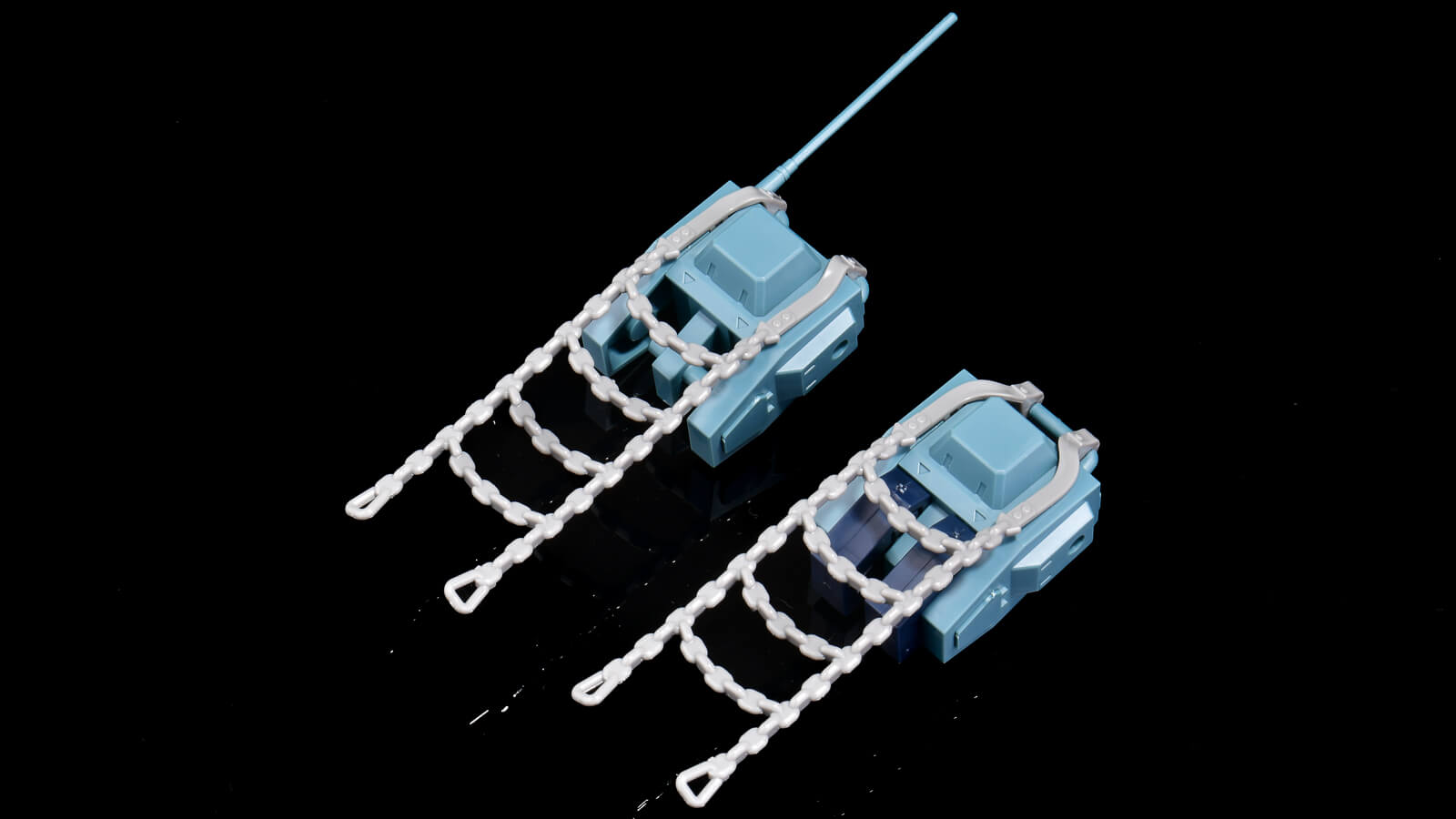 このキットの主役は「鎖」です。1パーツで、少し柔らかめのプラスチックで成型された鎖が、数々の装備を受け止めます。この鎖に、アタッチメントパーツを介して装備されるわけです。鎖は実際の兵器でも「チェーンカーテン」という防御アイテムとしても機能するので、ミリタリーライクなスコープドッグにはとても相性の良いアイテムと言えます。