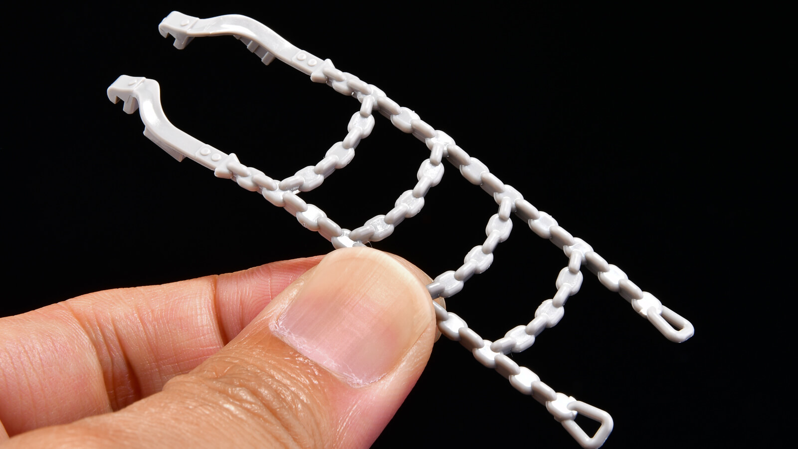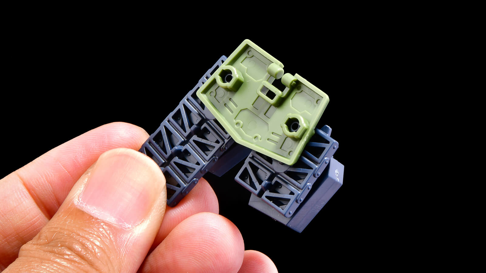 色分けもこだわっており、鎖にマウントするためのアタッチメントを別パーツにしています。コンテナや筒状のアクセサリーを輪切り状にしたものを組み合わせていくようになっています。