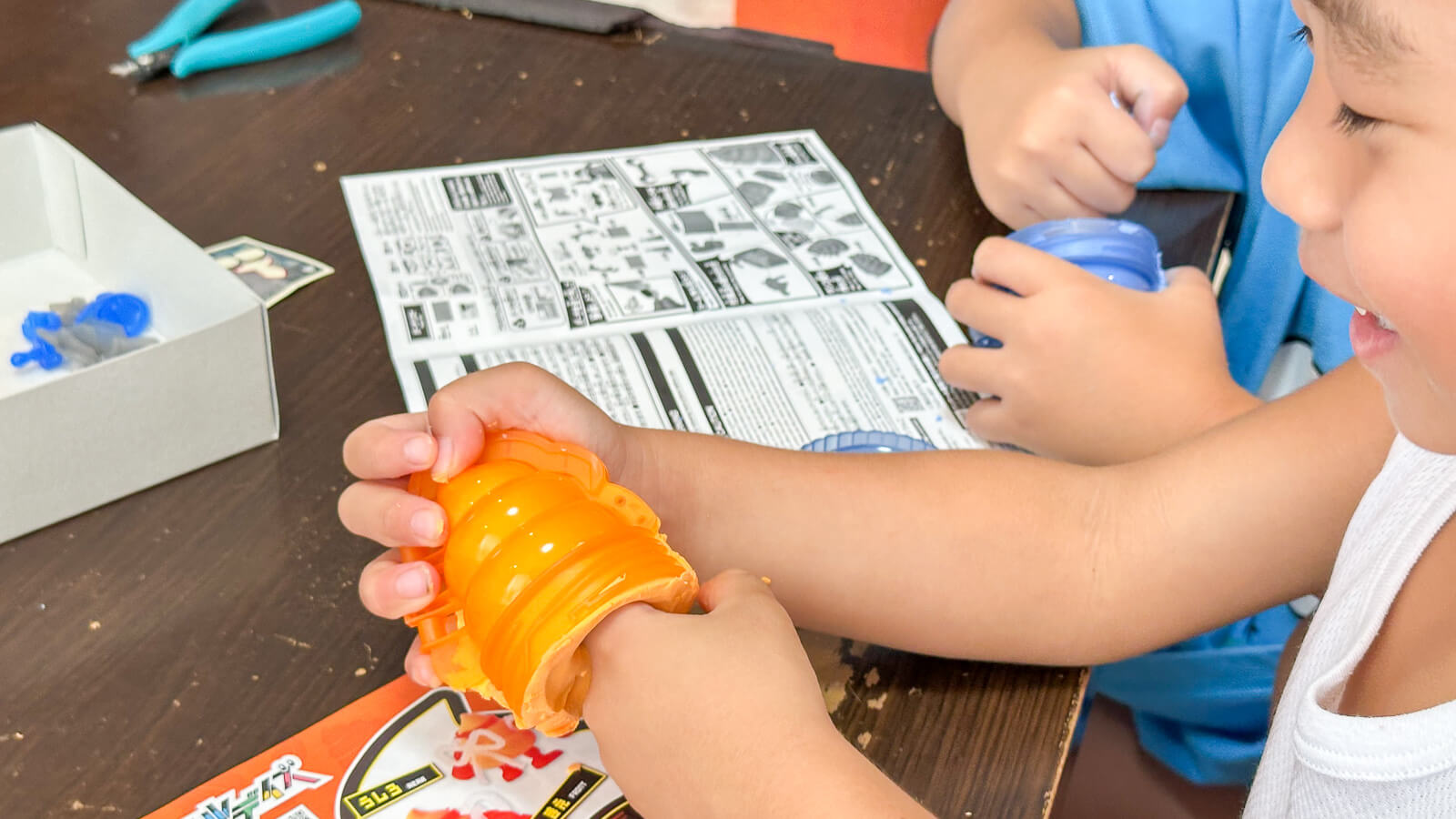 小さなお子さんでも安全に作れるようにパーツは、ニッパーがなくてもランナーから手でもぎ取れる「タッチゲート」方式。幼稚園の弟も、一人で上手にパーツを外していきます。一方、プラモに少し慣れているお兄ちゃんは、「僕はニッパーを使うんだ」と、少し得意げ。そして弟に「切り取ったパーツは無くさないように箱に入れるんだよ」と教えてあげる。そんな兄弟の姿も、見ていて微笑ましいですね。