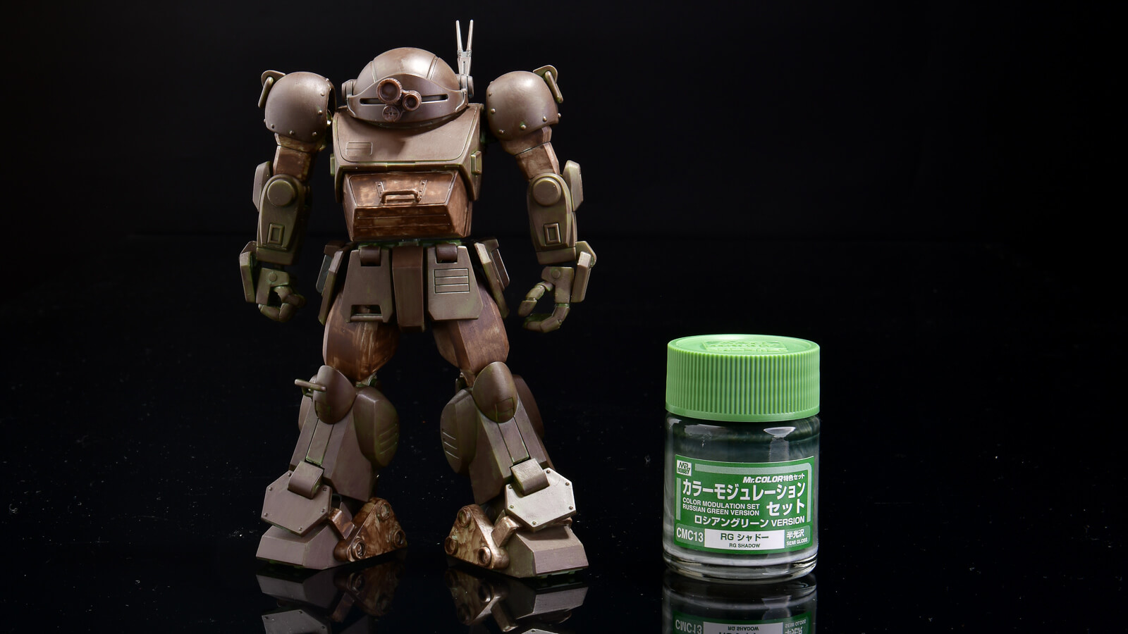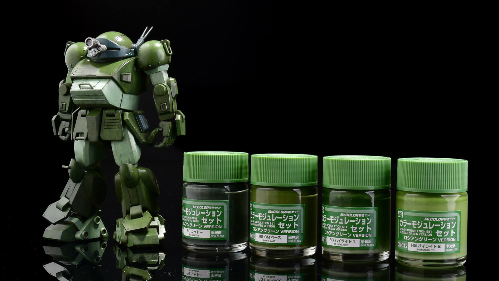 次は「RG CM ベース」というからモジュレーションセットの「基本色」として使用されるロシアングリーン。この色を基準に暗くしたのが「RGシャドー」。明るくしたのが「RG ハイライト1」、「RGハイライト2」というわけです。