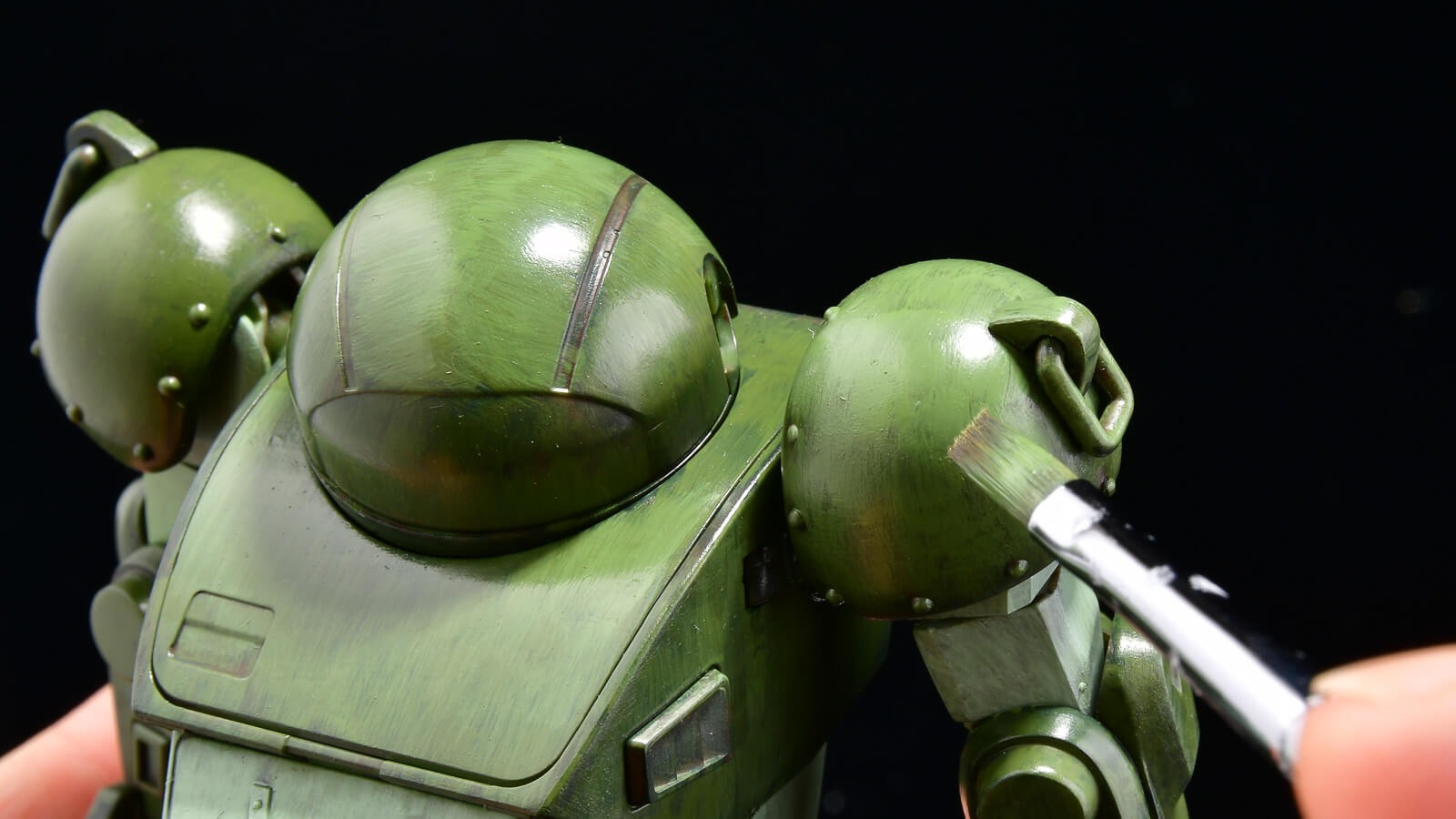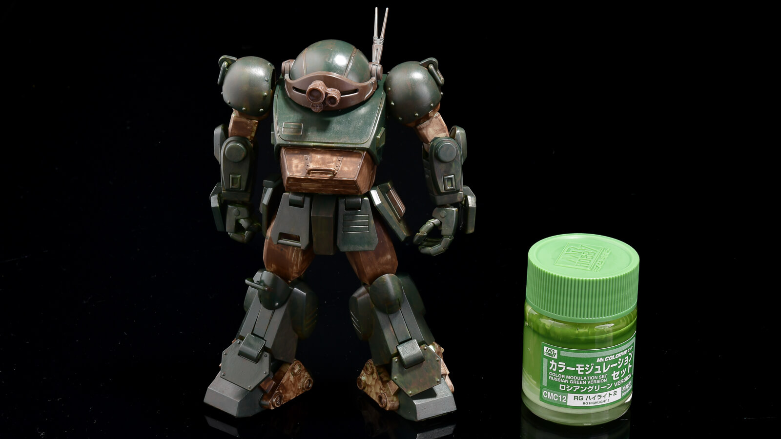 混色無しで見事グリーンのグラデーション塗装が完了しました! カラーモジュレーションは、近似色をうまく活用し明暗差をくっきりさせて、物の立体感を強調する塗り方。そのために開発された塗料なので、近似色のバランスが見事に取れています。だからこそ、通常のグラデーション塗装にも筆塗りのタッチにも混色無しで活用できます。日本を代表する戦車モデラーが生み出した至高のロシアングリーンで、あなたの量産メカもカッコ良くなること間違い無し。ぜひ今すぐゲットしてくださいね! それでは〜。