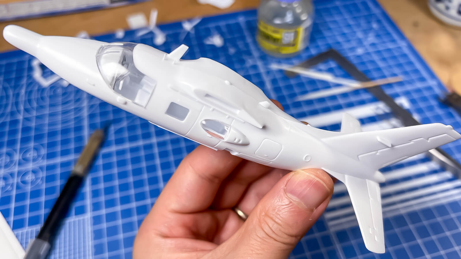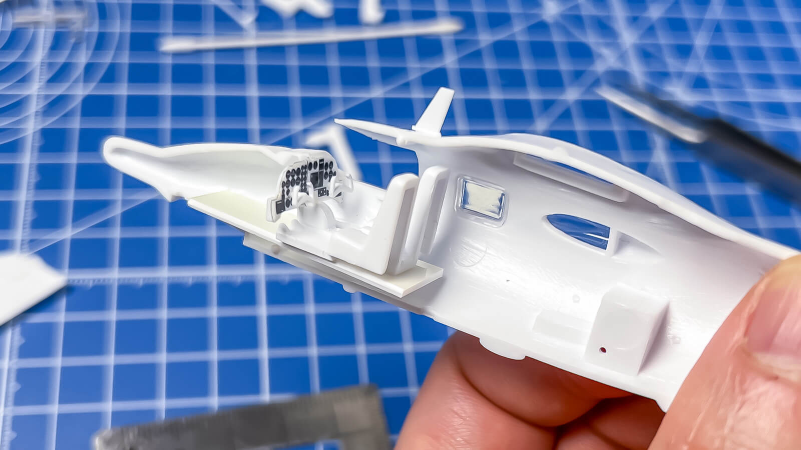 部品の合いは時代なりで、大まかな外形はきれいに閉じる。問題は左右分割の胴体内に閉じるコックピットにのりしろが存在しないといっていい状態で、自分は前輪収納庫の裏の平面から適当なプラバンを伸ばして支持した。他に着陸脚の開閉扉ものりしろが不明瞭で説明書に書かれている以上の工夫を要求してくる箇所だった。