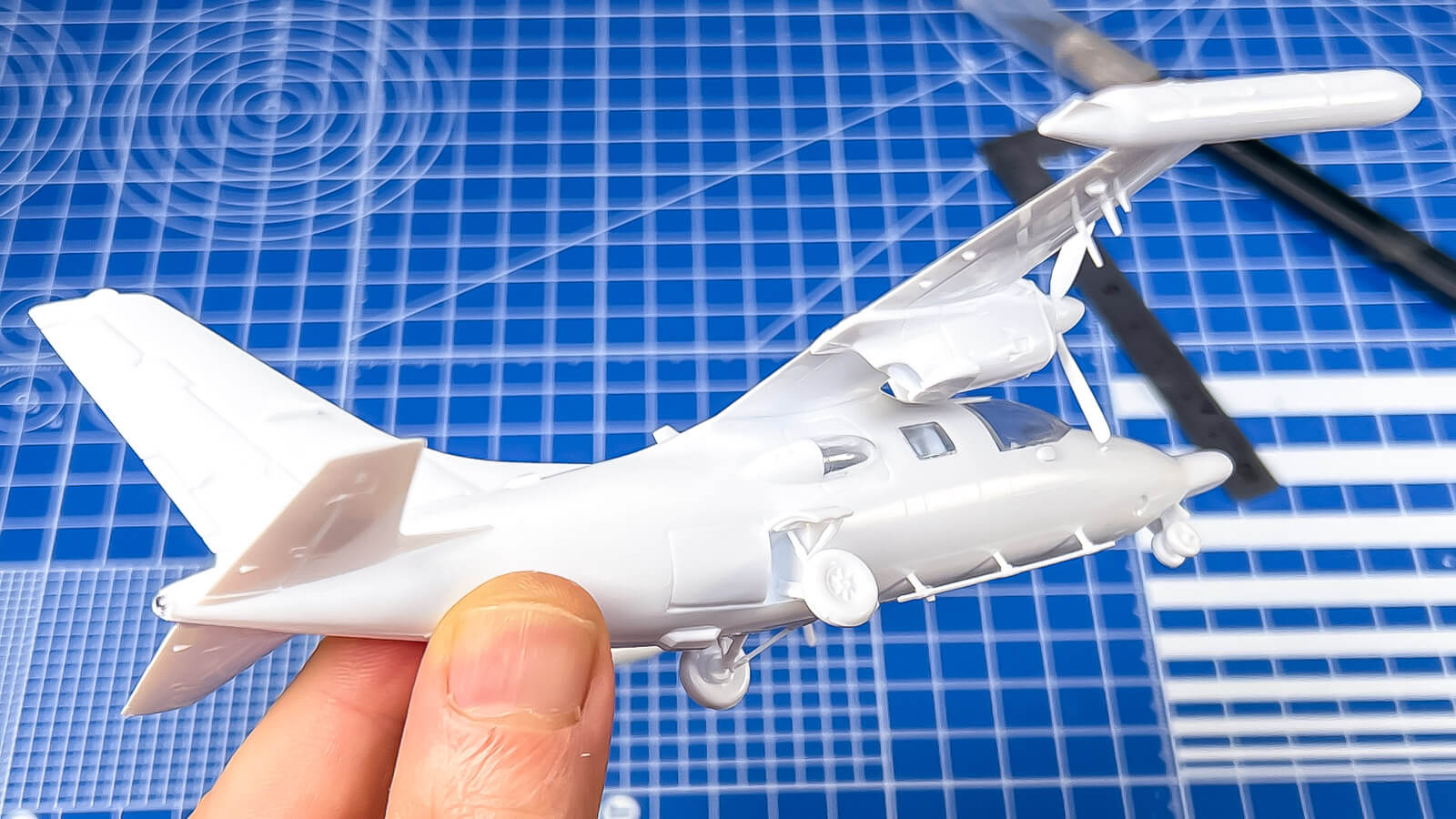 組み進めてみるとこの飛行機は表面に飛び出してくる膨らみや突起が多くて意外なほど武骨な印象。スライドドア上下のレールや張り出した観測窓、腹部に並んだ涙滴状膨らみ、直径1ミリにも満たない細さで部品化されたアンテナやピトー管。面白いところでは正面キャノピーにワイパーが彫刻されている。ランナー状態で見た時よりずっと「濃い味」に仕上がっていく。